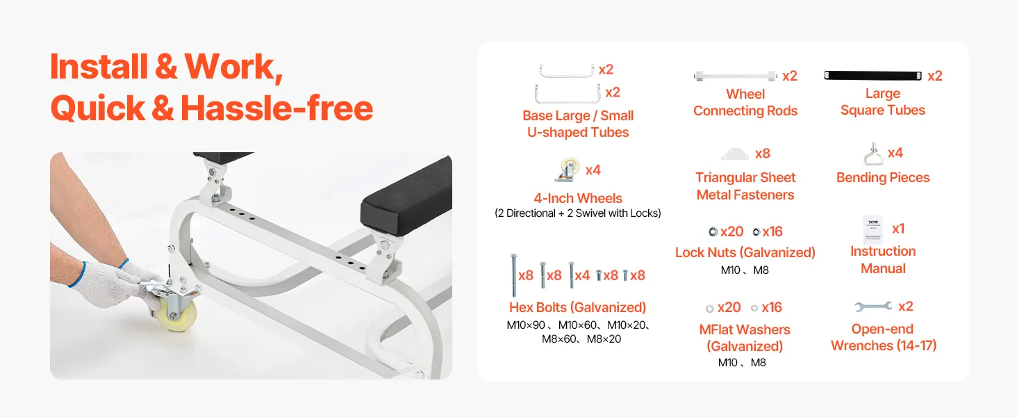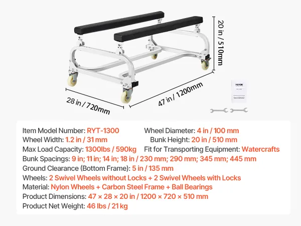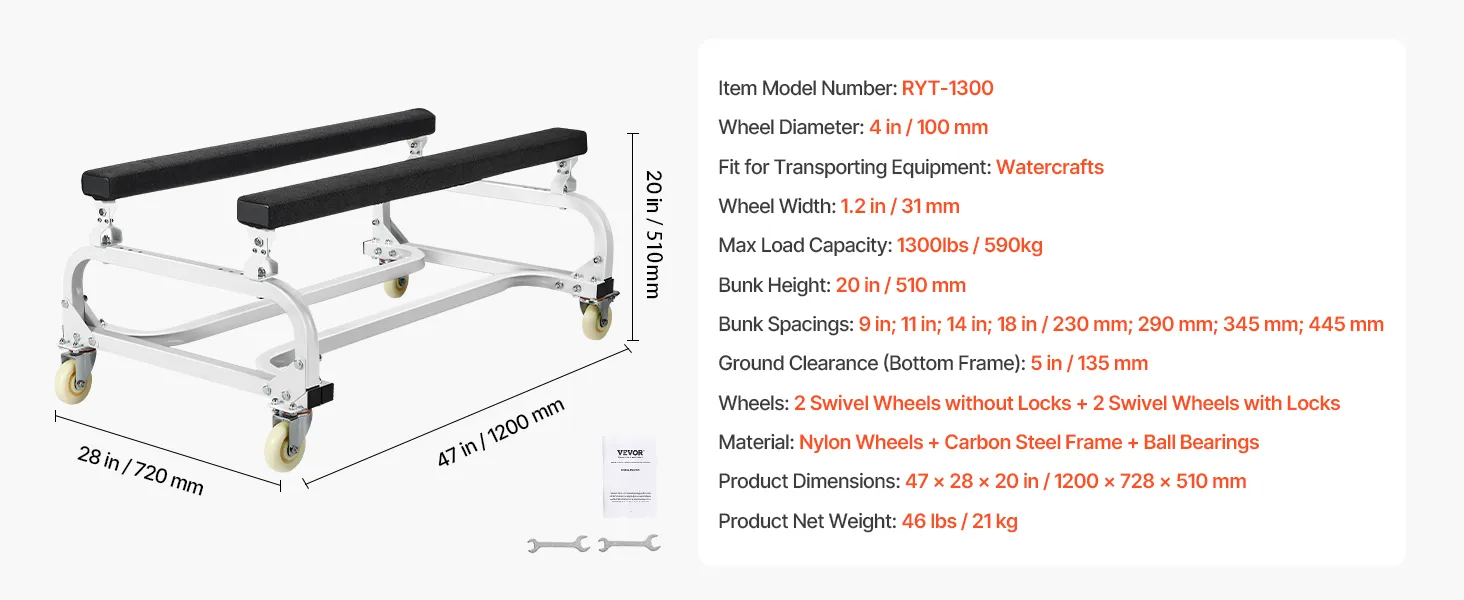 Complete Accessories: Our watercraft dolly stand comes with all necessary installation accessories and detailed instructions for quick assembly. After disassembly, the cart is compact and space-saving, significantly reducing storage costs.