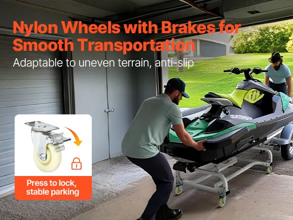 Durable Nylon Wheels: The nylon wheels are highly durable and load-bearing, enhanced with carbon steel brackets and ball bearings for improved flexibility and durability. The wheels of jet ski dolly can be locked during trailer connection, ensuring firm stability and avoiding sliding.