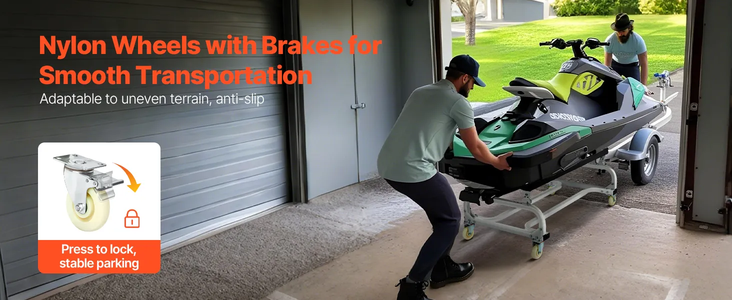 The heavy-duty jet ski cart features 360° nylon wheels for smooth, flexible steering, even with heavy loads. The carbon steel frame and ball bearings enhance load capacity, while two braked wheels provide added stability during transfers for secure movement.