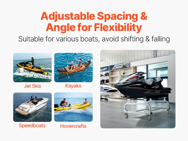Adjustable Spacing: Both the spacing and angle are adjustable, improving compatibility with various boat bottoms. This feature of watercraft dolly suits the storage and transportation needs of small to medium-sized boats, such as jet skis, kayaks, inflatable boats, and sailboats.