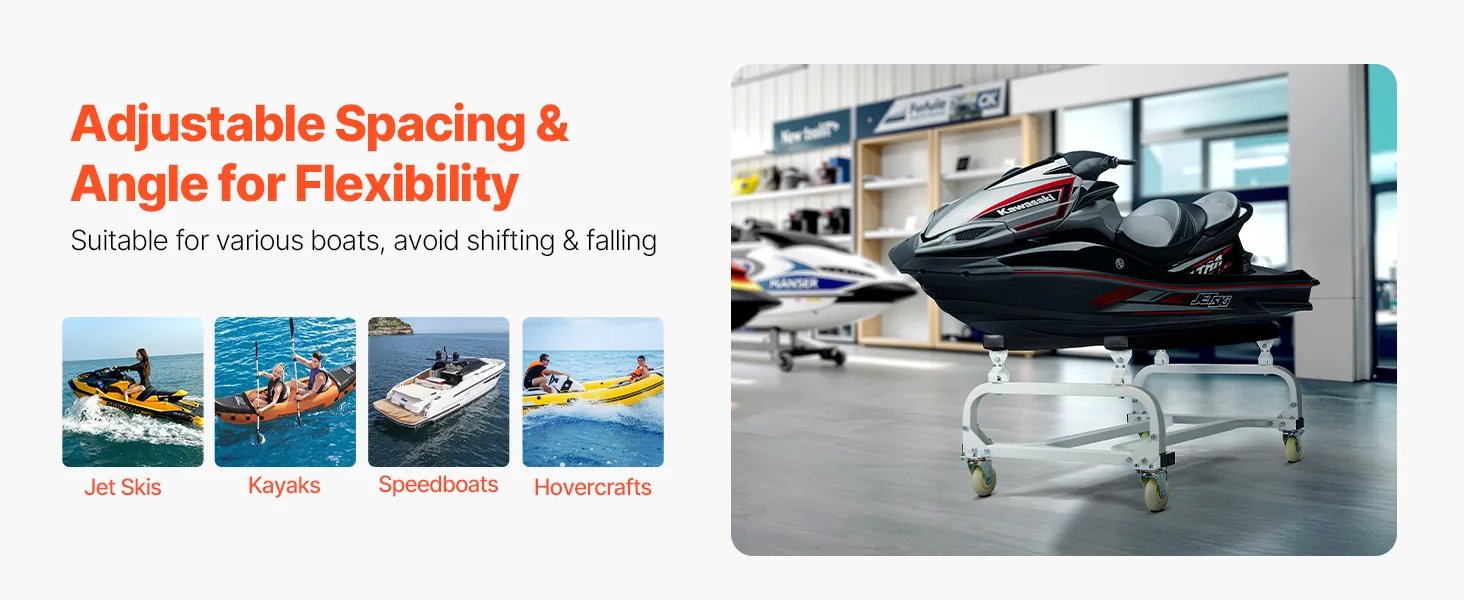 Both the spacing and angle of the bunk tubes are adjustable, making it compatible with various boat bottoms. The jet ski dolly is ideal for storing or moving medium to small-sized boats, including jet skis, kayaks, inflatable boats, and sailboats. Great for boat shops looking to display watercraft.