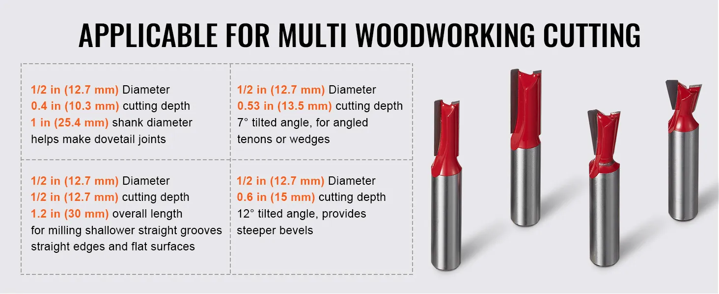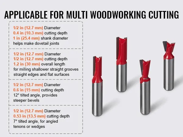 4 Handy Router Bits Included: Why limit yourself? This dovetail jig for woodworking comes with 4 different sizes of straight and dovetail router bits, that allows you can tackle everything from milling shallow grooves, straight edges, flat surfaces, bevel joints, and wedge joints for various woodworking tasks.
