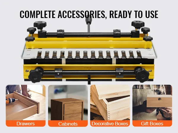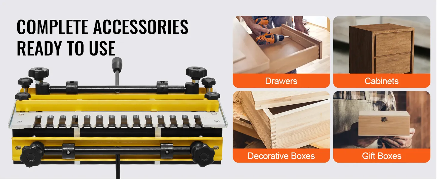 The dovetail jig comes with all necessary accessories for immediate use, catering to both professional woodworkers and DIY enthusiasts. Ideal for crafting drawers, cabinets, decorative boxes, gift boxes, and more, this dovetail router jig is an invaluable addition to any workshop.