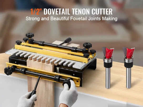 This dovetail jig includes two 1/2" dovetail router bits, ideal for creating strong and appealing dovetail joints. The dovetail joints have excellent tensile strength, as their unique shape makes it difficult for the connected pieces to be pulled apart.