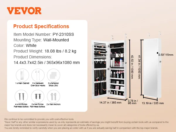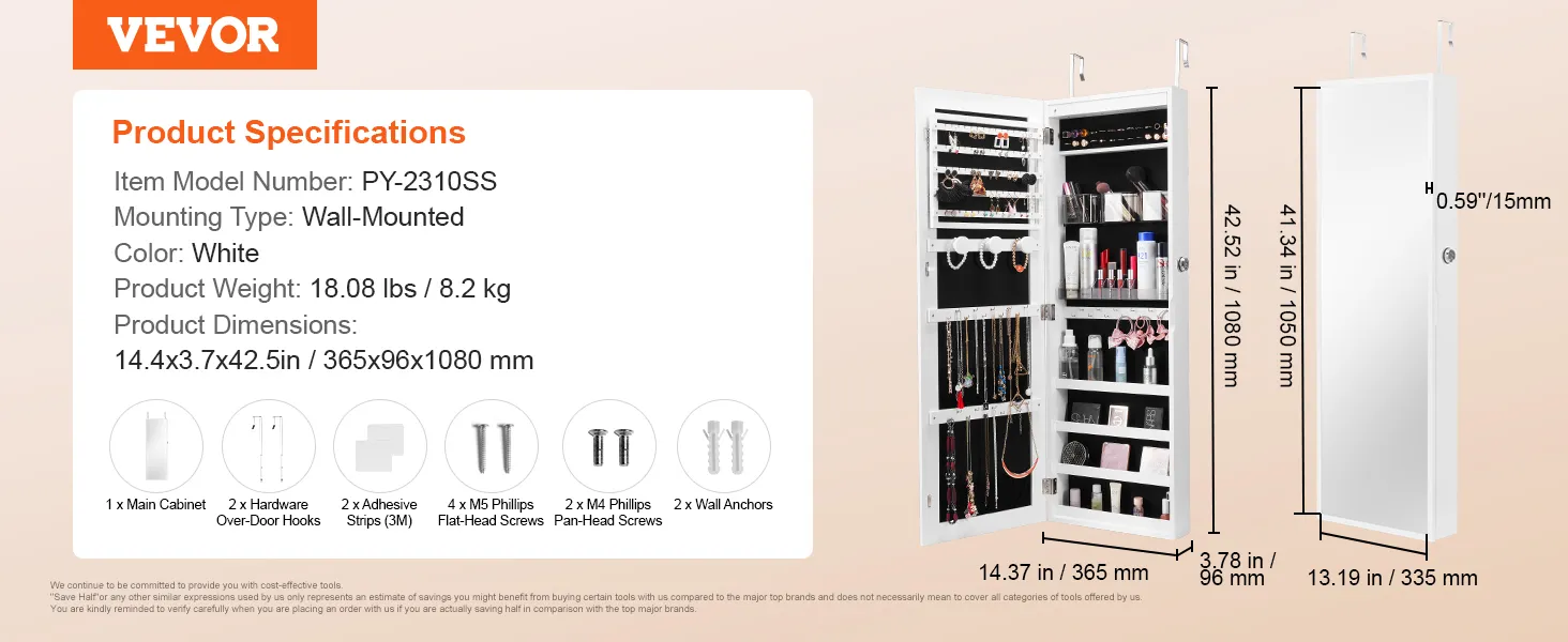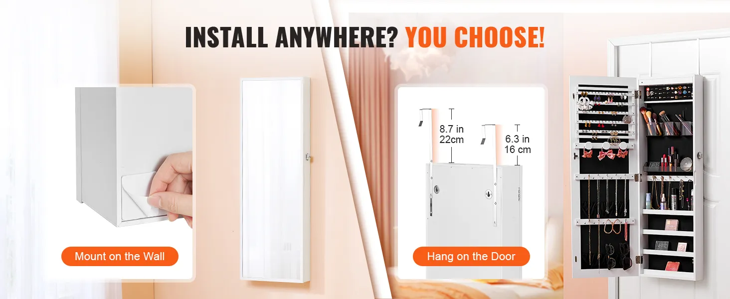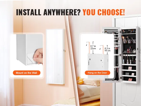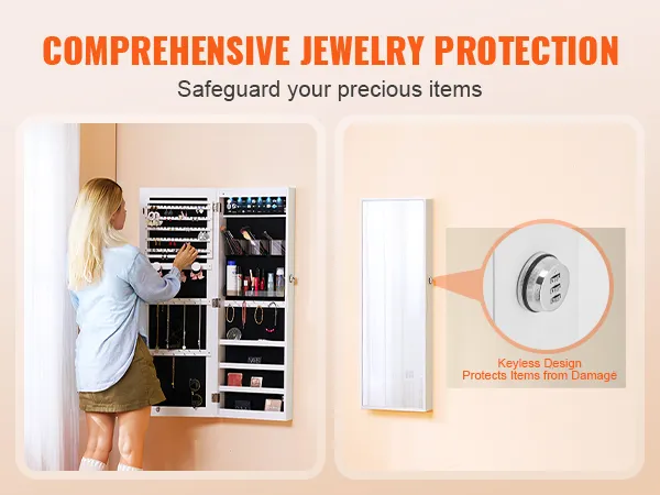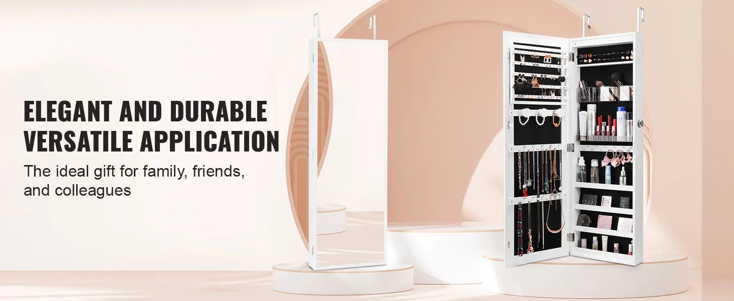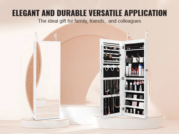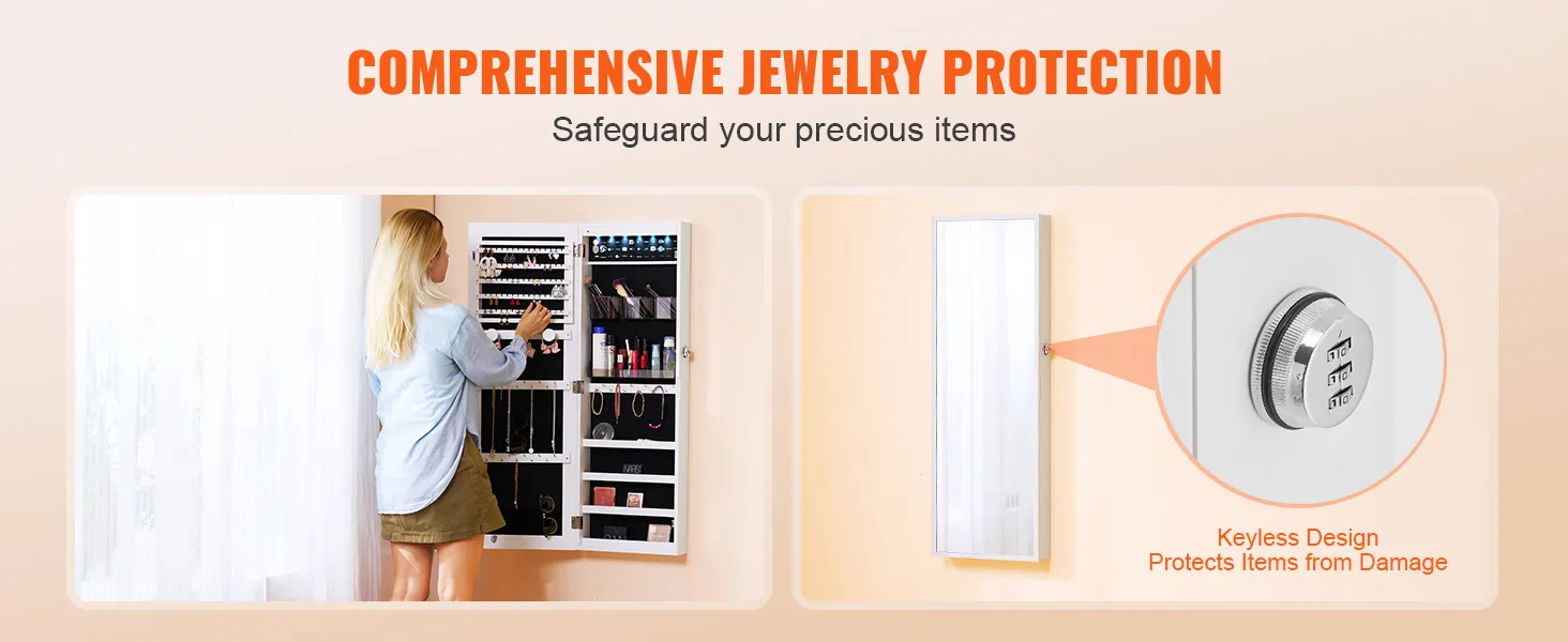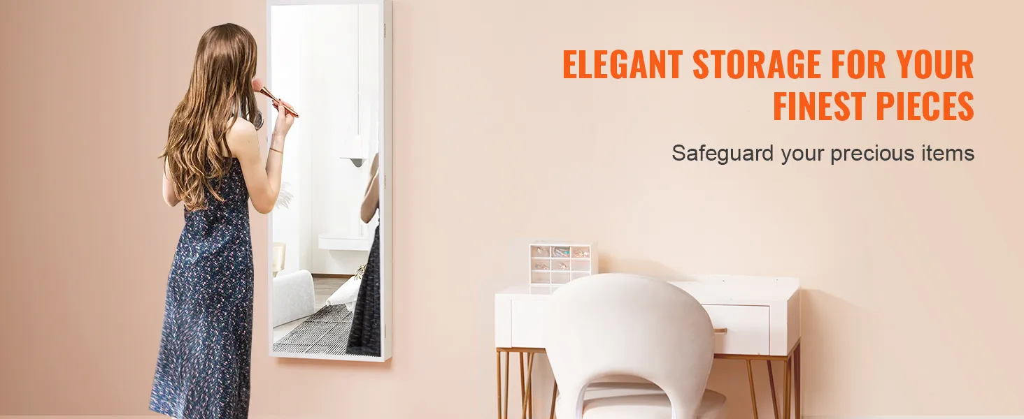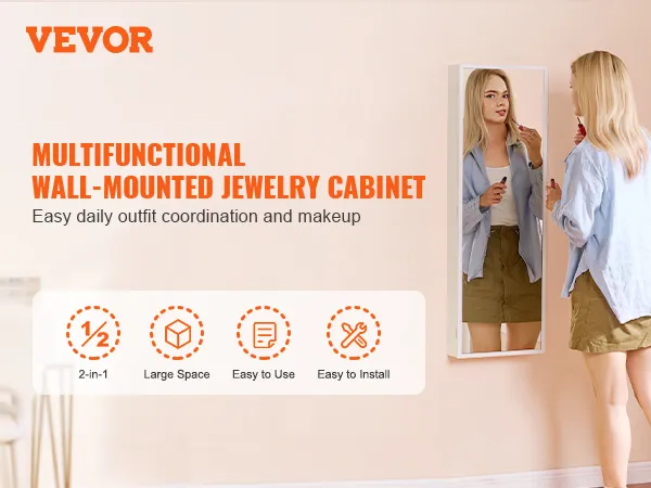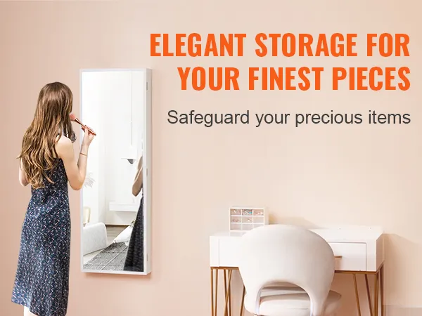 2-in-1 Functionality: The VEVOR mirror jewelry cabinet is not only a jewelry organizer but also a full-length mirror, providing a head-to-toe view of your outfit. The mirror's full-screen design is stylish and elegant, perfect for checking your jewelry and makeup before heading out or attending events.