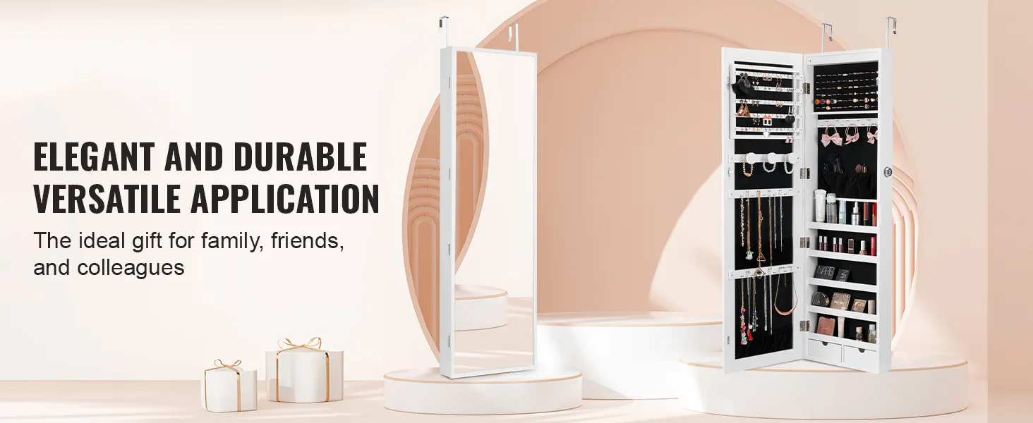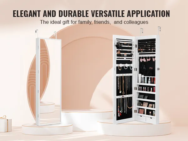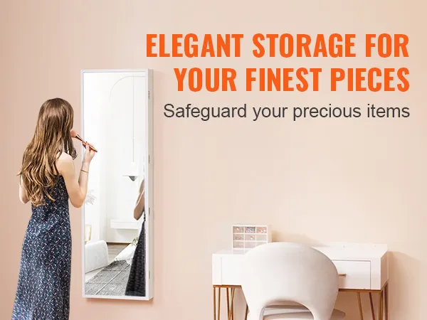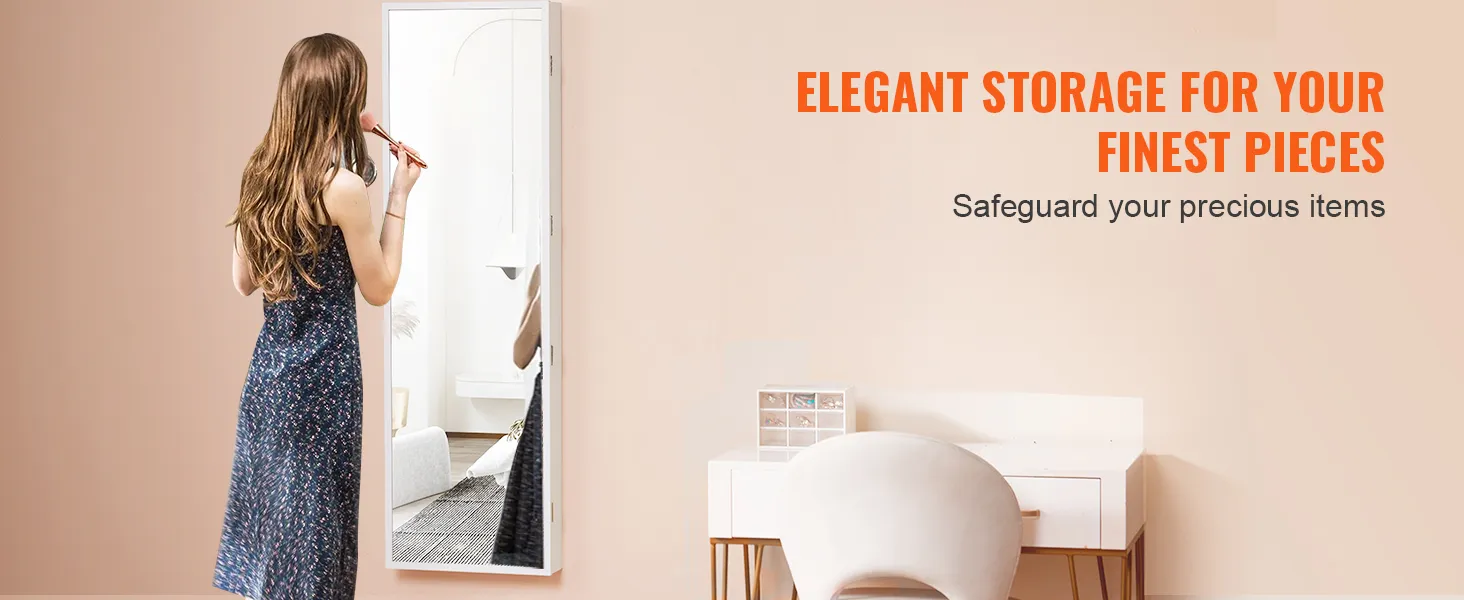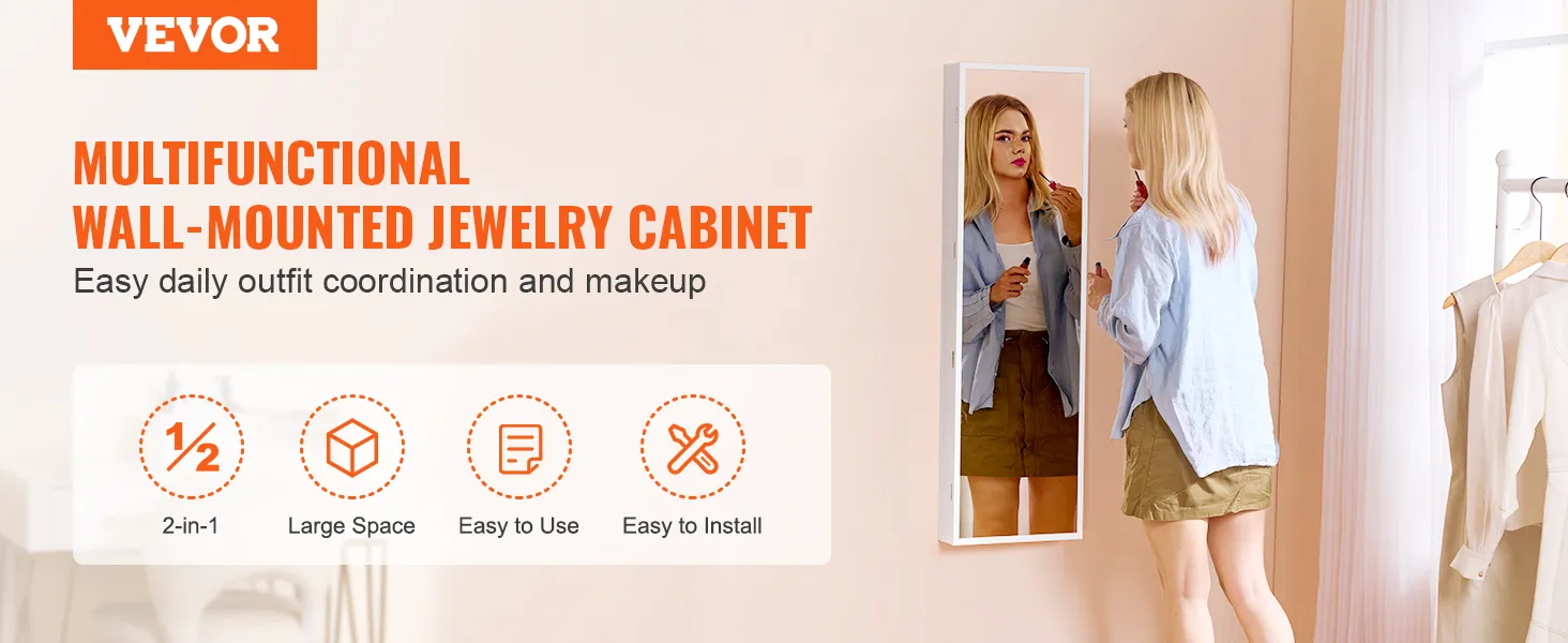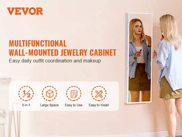 2-in-1 Functionality: The VEVOR mirror jewelry cabinet is not only a jewelry organizer but also a full-length mirror, providing a head-to-toe view of your outfit. The mirror's full-screen design is stylish and elegant, perfect for checking your jewelry and makeup before heading out or attending events.