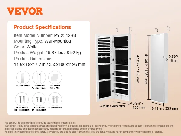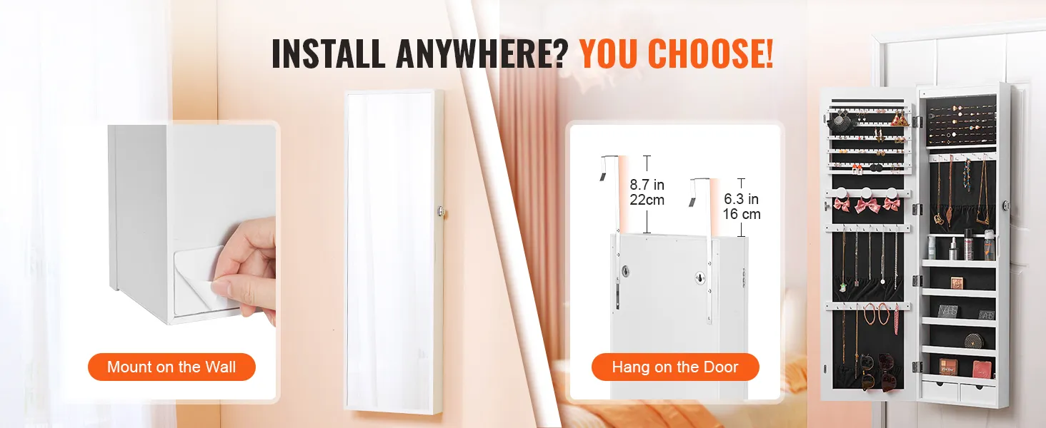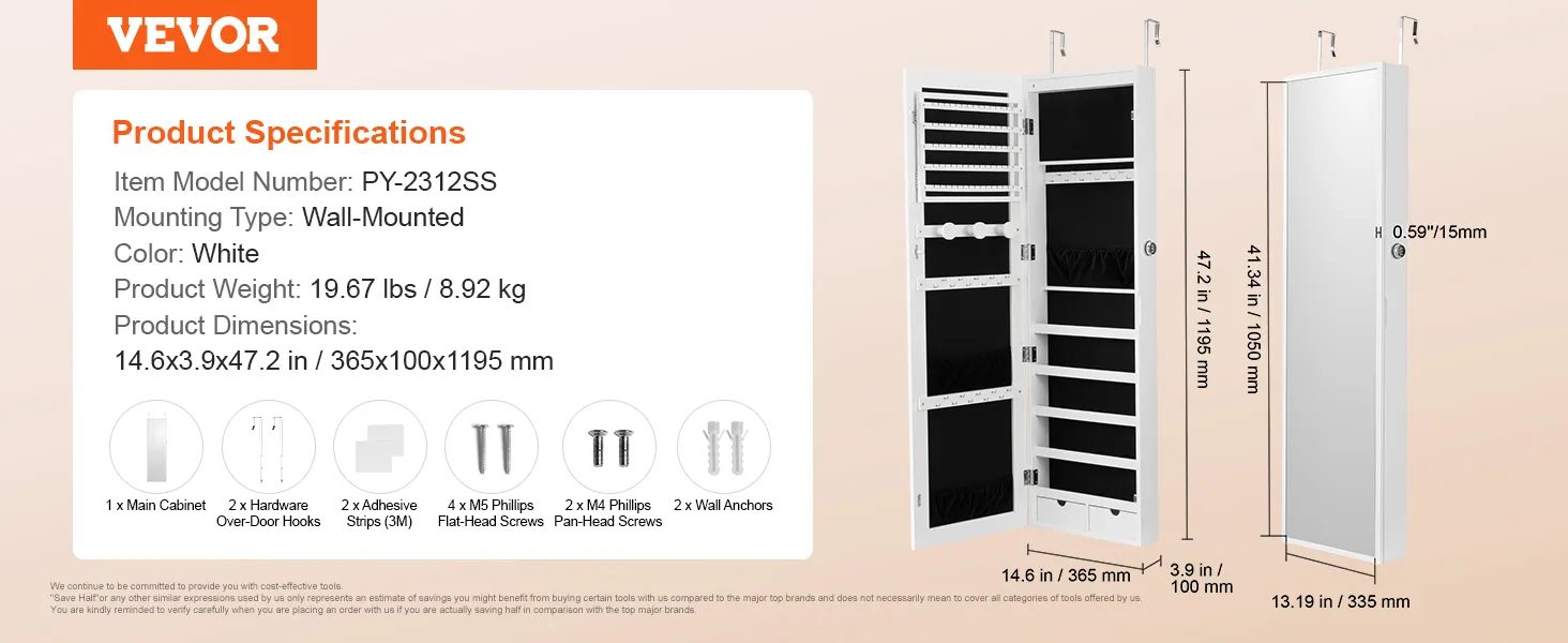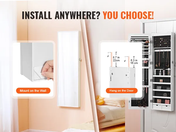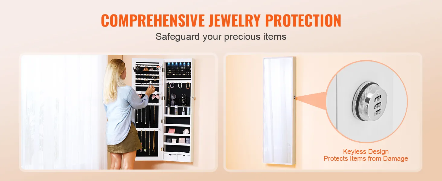 2-in-1 Functionality: The VEVOR mirror jewelry cabinet is not only a jewelry organizer but also a full-length mirror, providing a head-to-toe view of your outfit. The mirror's full-screen design is stylish and elegant, perfect for checking your jewelry and makeup before heading out or attending events.