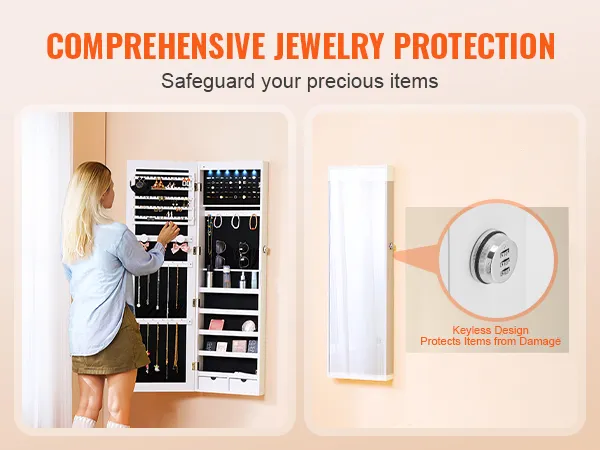 The jewelry cabinet armoire with mirror features high-quality velvet-lined pockets, ensuring your necklaces remain scratch-free and tangle-free. The keyless design not only prevents lost keys but also keeps your valuables secure from playful children.