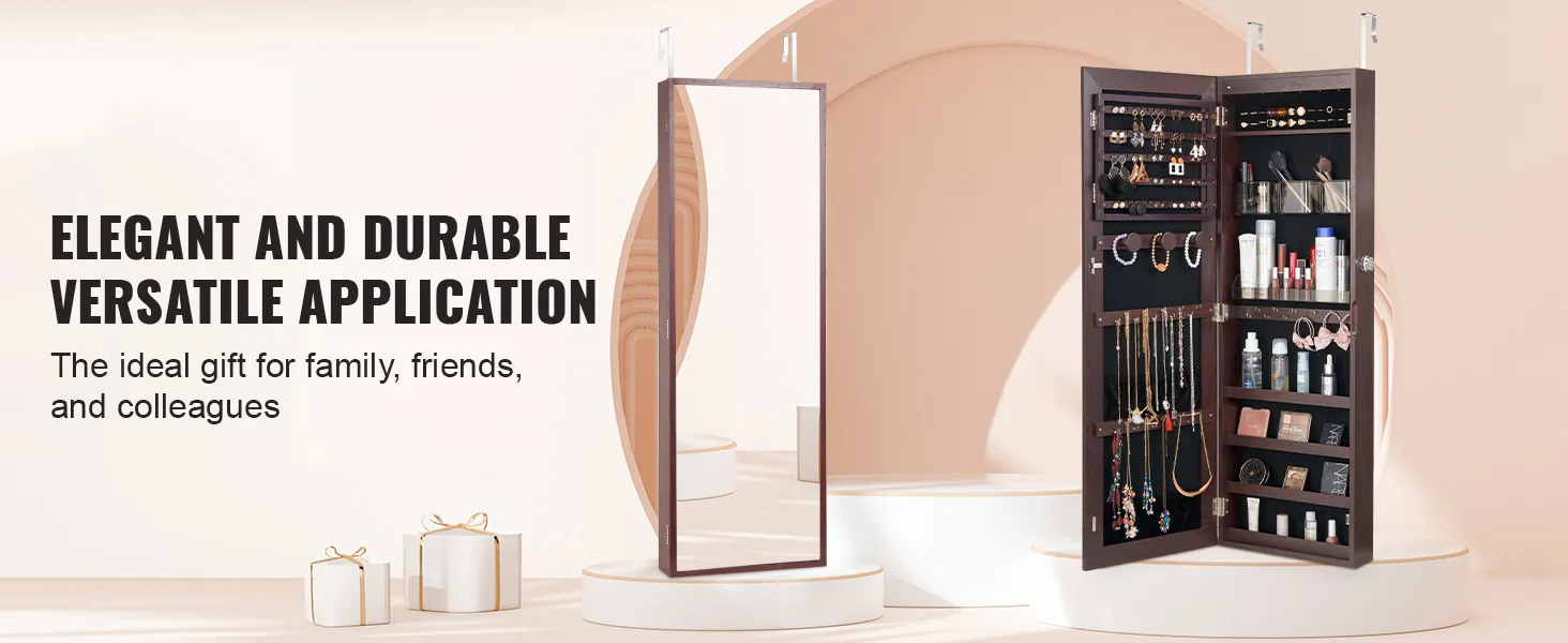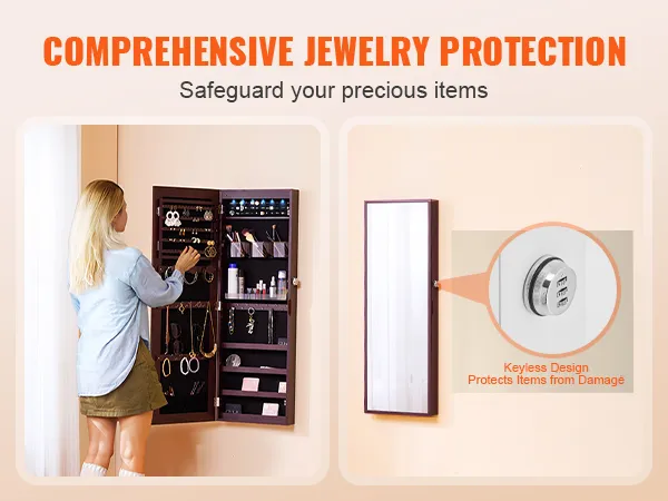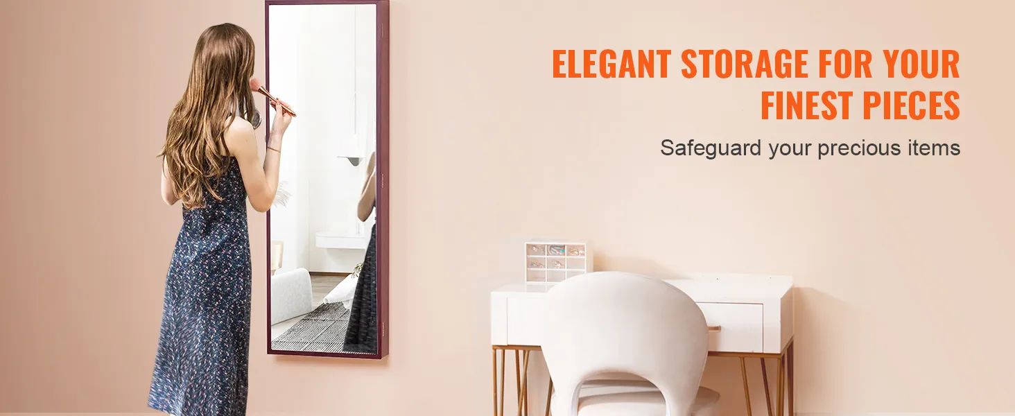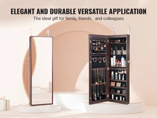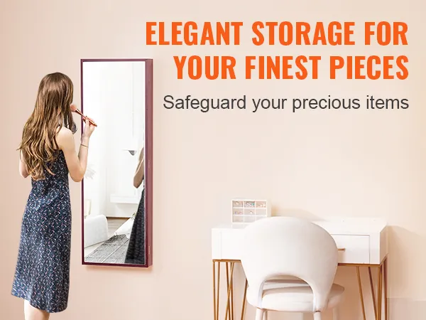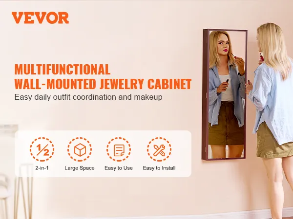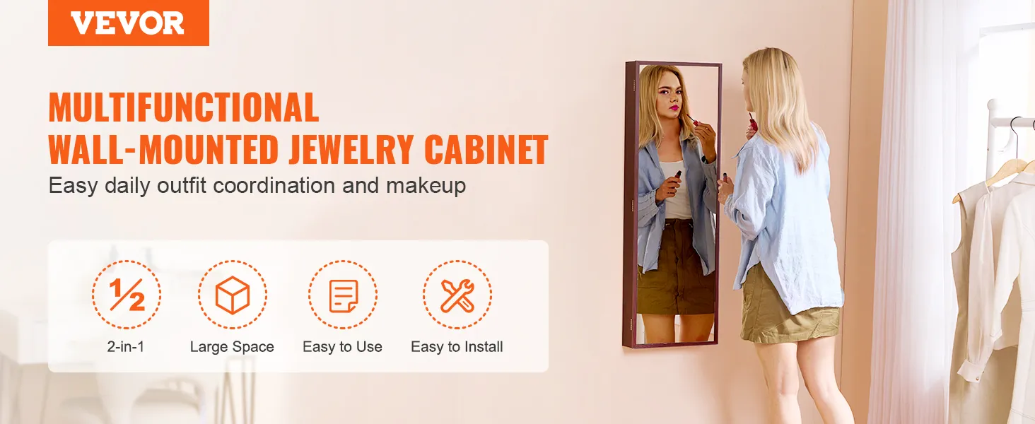 2-in-1 Functionality: The VEVOR mirror jewelry cabinet is not only a jewelry organizer but also a full-length mirror, providing a head-to-toe view of your outfit. The mirror's full-screen design is stylish and elegant, perfect for checking your jewelry and makeup before heading out or attending events.