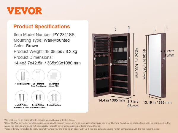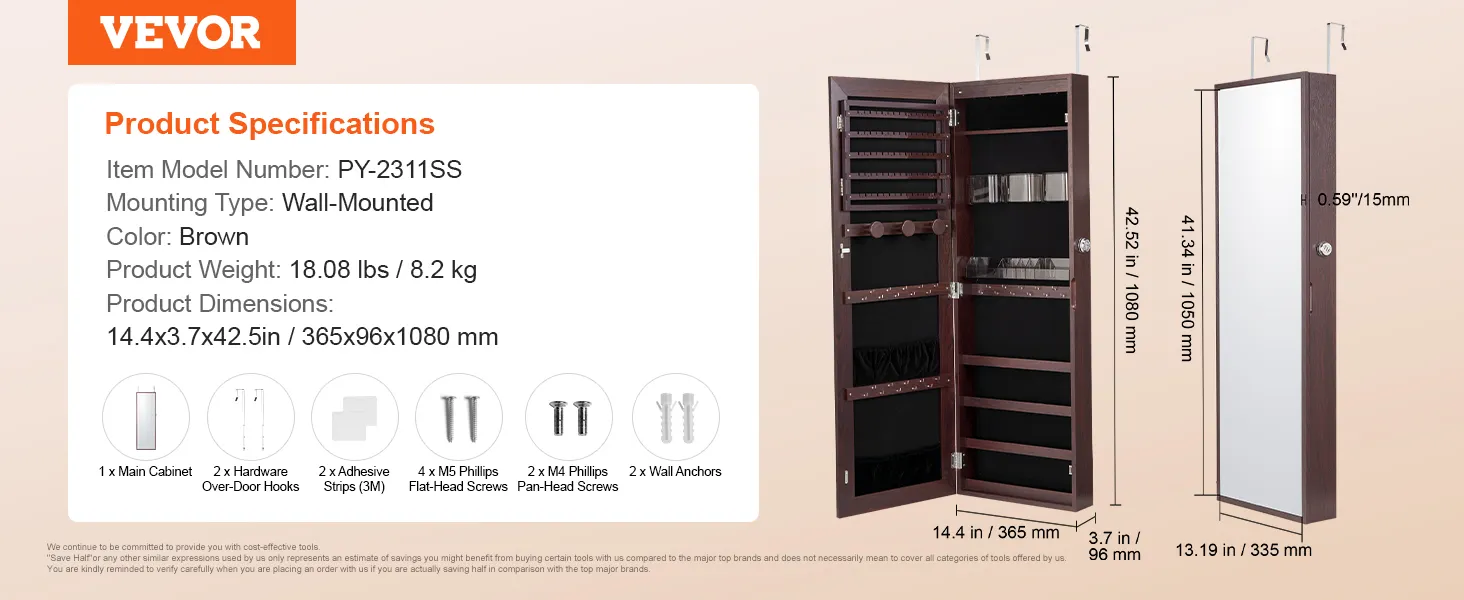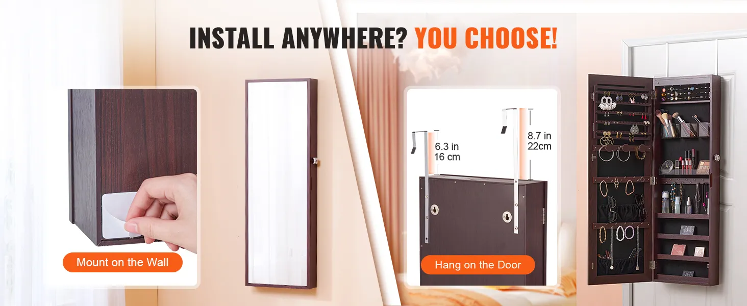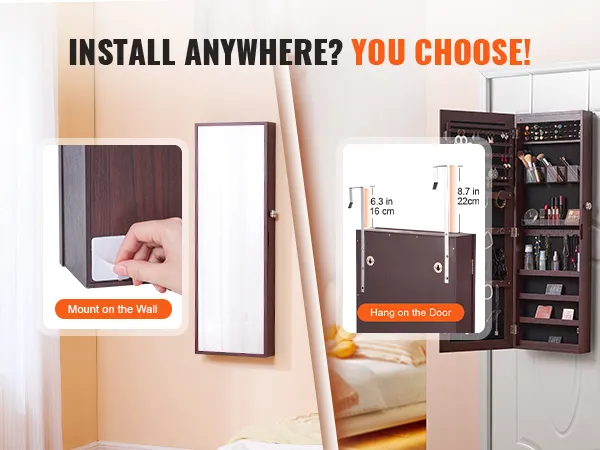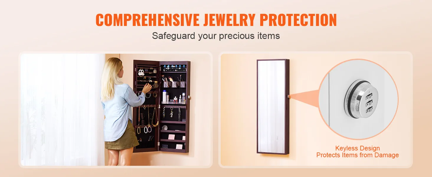 2-in-1 Functionality: The VEVOR mirror jewelry cabinet is not only a jewelry organizer but also a full-length mirror, providing a head-to-toe view of your outfit. The mirror's full-screen design is stylish and elegant, perfect for checking your jewelry and makeup before heading out or attending events.