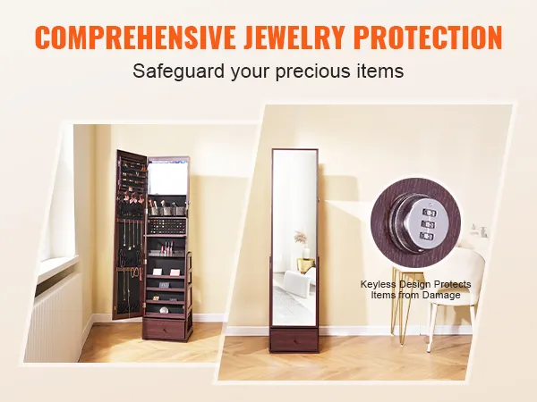 De staande sieradenspiegel is bekleed met hoogwaardig velours om te voorkomen dat uw kettingen bekrast of in de war raken. Het sleutelloze ontwerp voorkomt het verliezen van sleutels en beschermt uw waardevolle spullen tegen spelende kinderen.