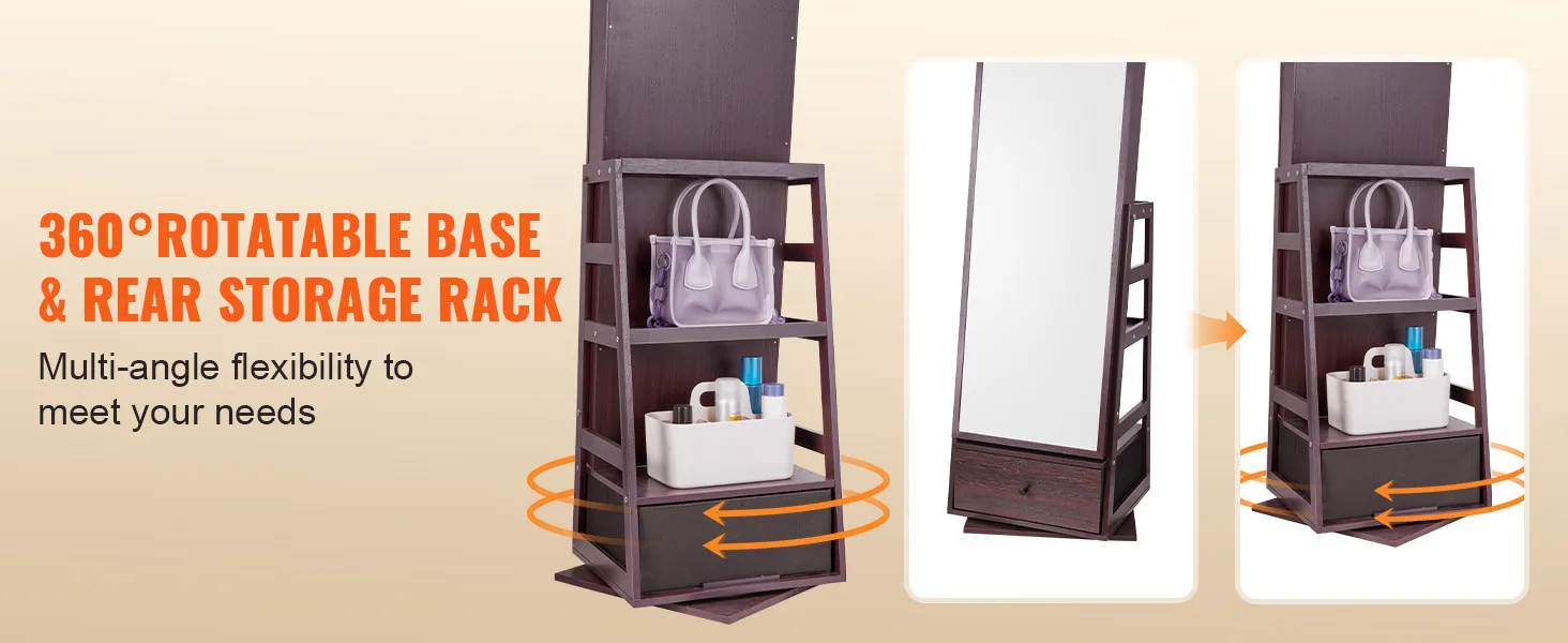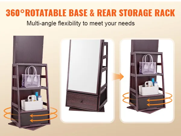 3-in-1 functionaliteit: De roterende staande spiegel met opbergruimte van VEVOR is niet alleen een sieradenorganizer, maar ook een passpiegel waarmee je je outfit van top tot teen kunt bekijken. Het heeft een grote, uitklapbare opberglade en opbergvakken, waardoor het een onmisbare dagelijkse hulp is voor elk meisje.