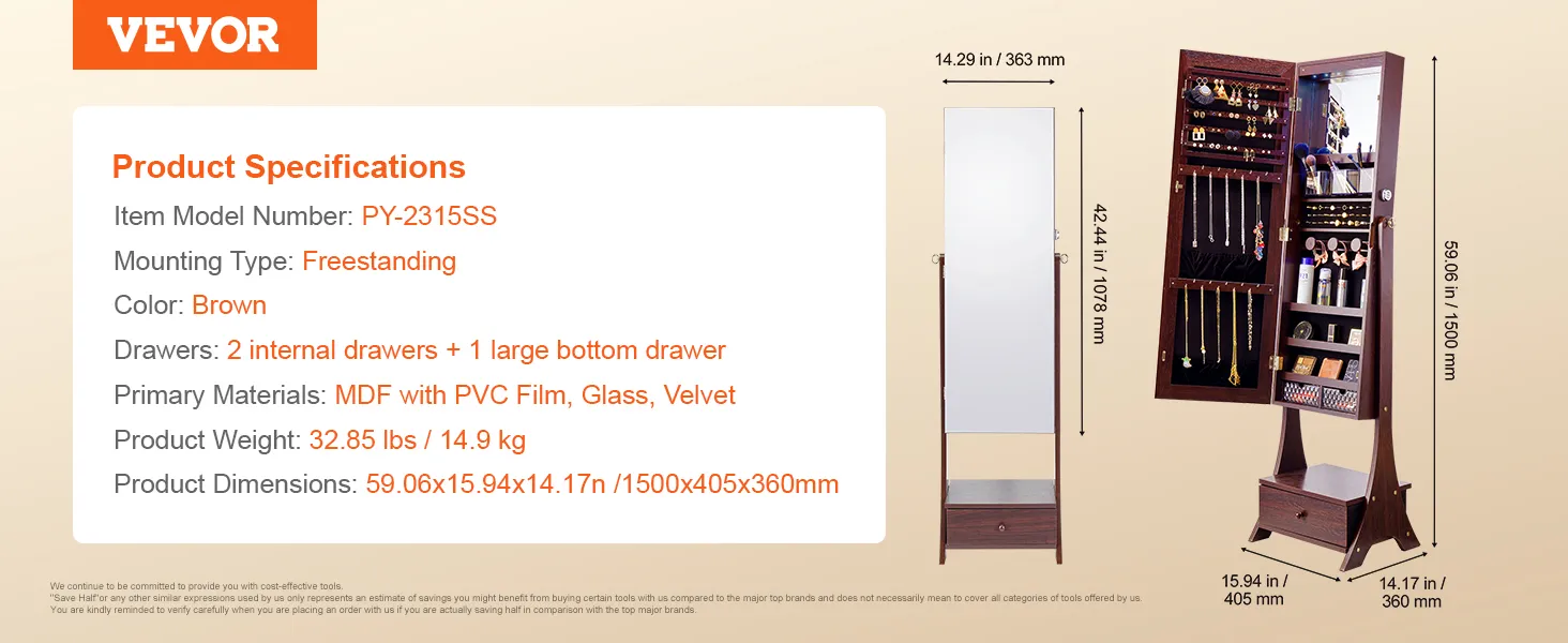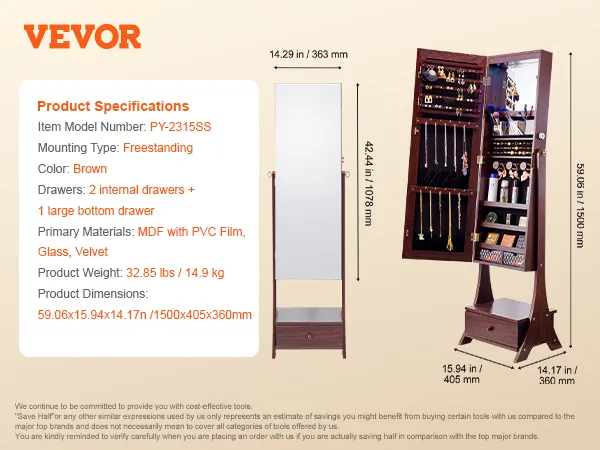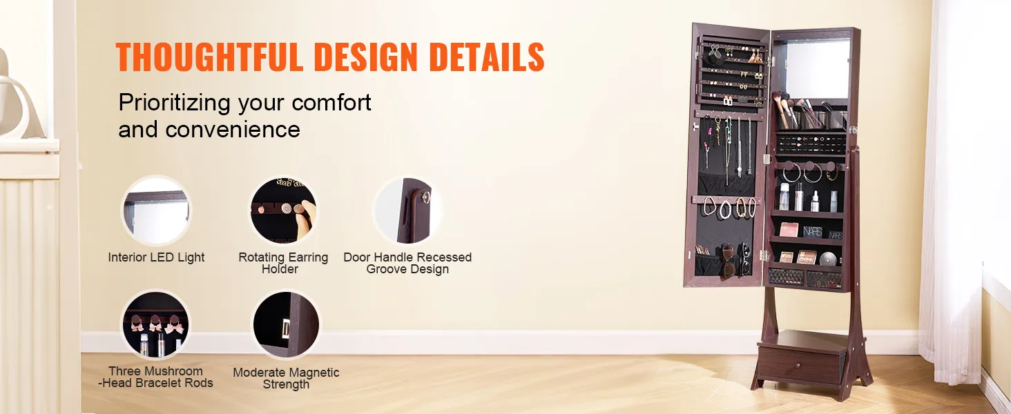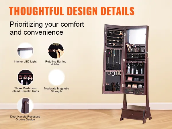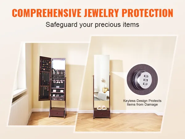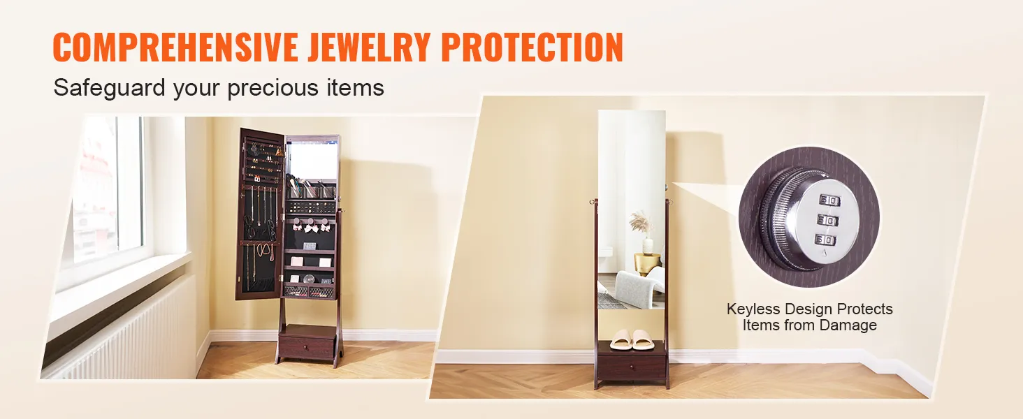 VEVOR Mirror Jewelry Cabinet, Standing Mirror with Storage, Lockable Jewelry Mirror Organizer with Full Length Mirror, Velvet Lining, Interior LED Light, Drawer, Freestanding Jewelry Armoire, Brown VEVOR Mirror Jewelry Cabinet, Standing Mirror with Storage, Lockable Jewelry Mirror Organizer with Full Length Mirror, Velvet Lining, Interior LED Light, Drawer, Freestanding Jewelry Armoire, Brown