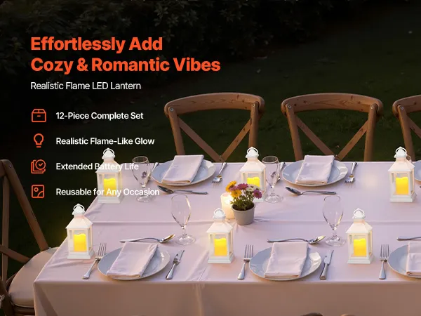 Een set van 12 elektrische kaarslantaarns creëert een realistisch vlameffect zonder brandgevaar. Geschikt voor bruiloftstafels, feestdagen en interieurdecoratie, en creëert een warme en romantische sfeer voor elke gelegenheid.