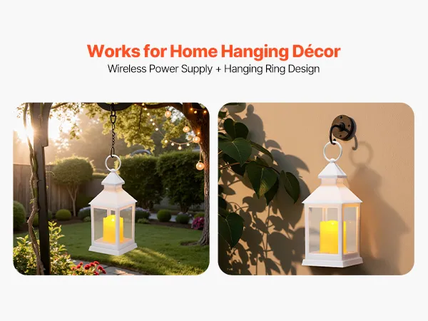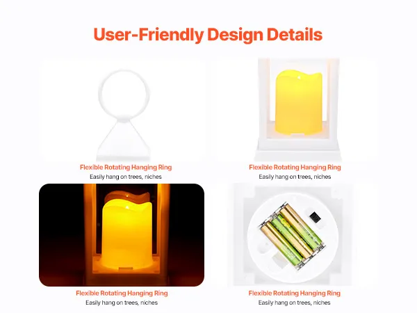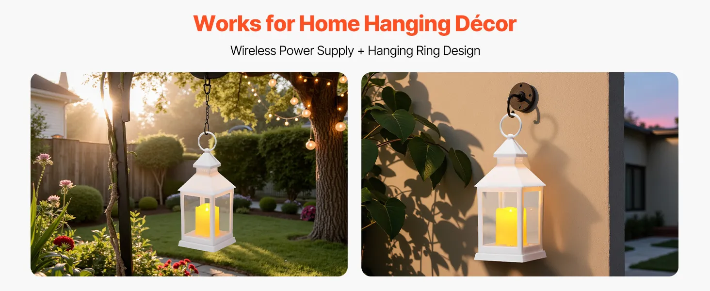 Wandmontage & tafelmodel: Met een ophangring aan de bovenkant (binnendiameter: 4 cm, draaddiameter: 5 cm) kunnen deze decoratieve lantaarns buiten worden opgehangen aan kerstbomen, schuttingen, veranda's of muren. Dankzij de batterijvoeding en het draadloze gemak zijn ze flexibel te plaatsen.
