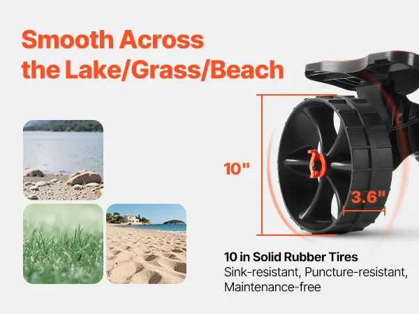 Soepele rit: Uitgerust met 25,4 cm dikke rubberen wielen en 9 cm dikke banden glijdt deze kajaktrolley moeiteloos over zand, grind en gras. Oppompen is niet nodig: geniet van een zorgeloze, onderhoudsvrije ervaring op elk terrein.