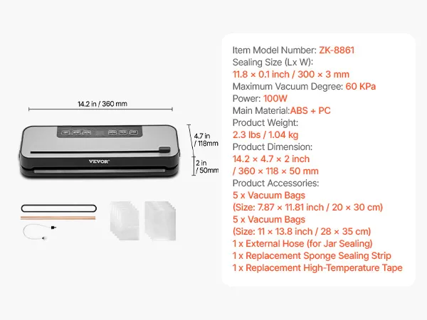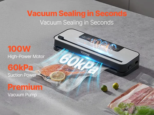 60 kPa sterke zuigkracht: De vacuümsealer is gemaakt van hoogwaardige PC- en ABS-materialen en garandeert betrouwbare en langdurige prestaties. Het is uitgerust met een hoogwaardige vacuümpomp die een ultrasterke zuigkracht levert van maximaal 60 kPa. De krachtige 100W-motor ondersteunt continu stofzuigen, waardoor deze stofzuiger ideaal is voor het uitvoeren van grote voedselconserveringsklussen thuis. Het is een onmisbare en efficiënte hulp voor uw keuken thuis