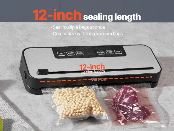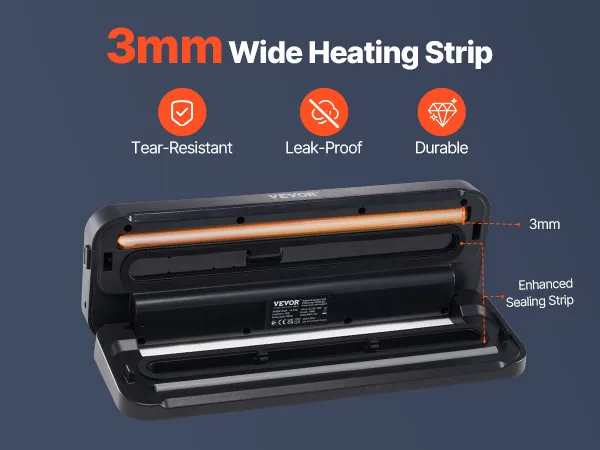 Verse seal: De speciaal ontwikkelde 3 mm brede verwarmingsstaaf zorgt voor een sterkere seal van de vacuümzakken. In combinatie met de duurzame en flexibele sealstrip biedt deze vleesvacuümmachine de beste sealprestaties. De zakken scheuren of lekken niet bij langdurige opslag, dus u kunt erop vertrouwen dat ze goed blijven. De verwarmingsstaaf is 30 cm lang, waardoor u eenvoudig grotere zakken of meerdere zakken tegelijk kunt sealen. Dit verbetert de efficiëntie en bespaart u tijd en stappen.