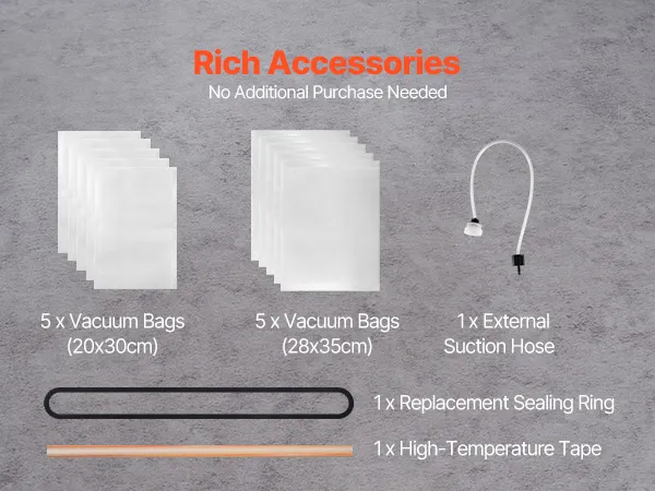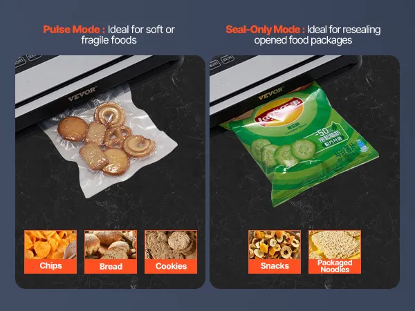 5-in-1 voor al uw behoeften: de vacuümsealer biedt verschillende functies om aan uw behoeften op het gebied van voedselconservering te voldoen. Het bevat 2 voedselmodi: de droge en vochtige modus, geschikt voor vlees, zeevruchten, fruit, groenten, noten en meer. In de pulsmodus kunt u de vacuümintensiteit regelen. Dankzij de enkele sealmodus is het probleem van het bewaren van aangebroken snacks opgelost. Bovendien wordt het geleverd met een externe slang voor het afsluiten van potten, waardoor het compatibel is met andere vacuümcontainers