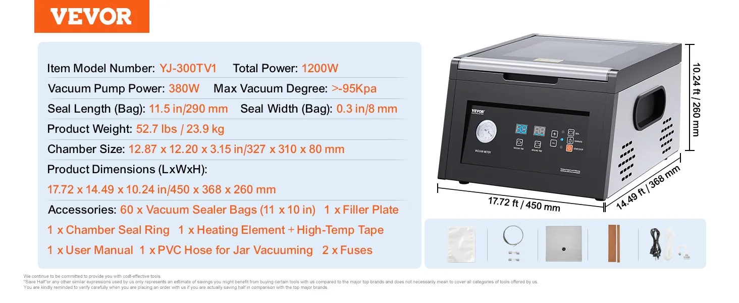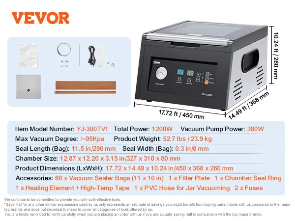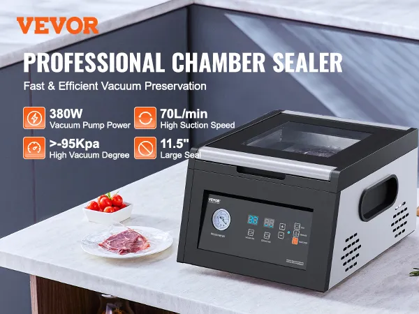 Tijdbesparende efficiëntie: Bent u het beu om te wachten tot uw sealer is afgekoeld? Onze kamersealer is uitgerust met een snelkoelende vacuümpomp en een aluminium afdichting. Verwerk grote hoeveelheden voedsel in één keer, zonder pauzes. De ruime kamer (32,5 x 31,5 x 8 cm) is cruciaal voor grote klussen.