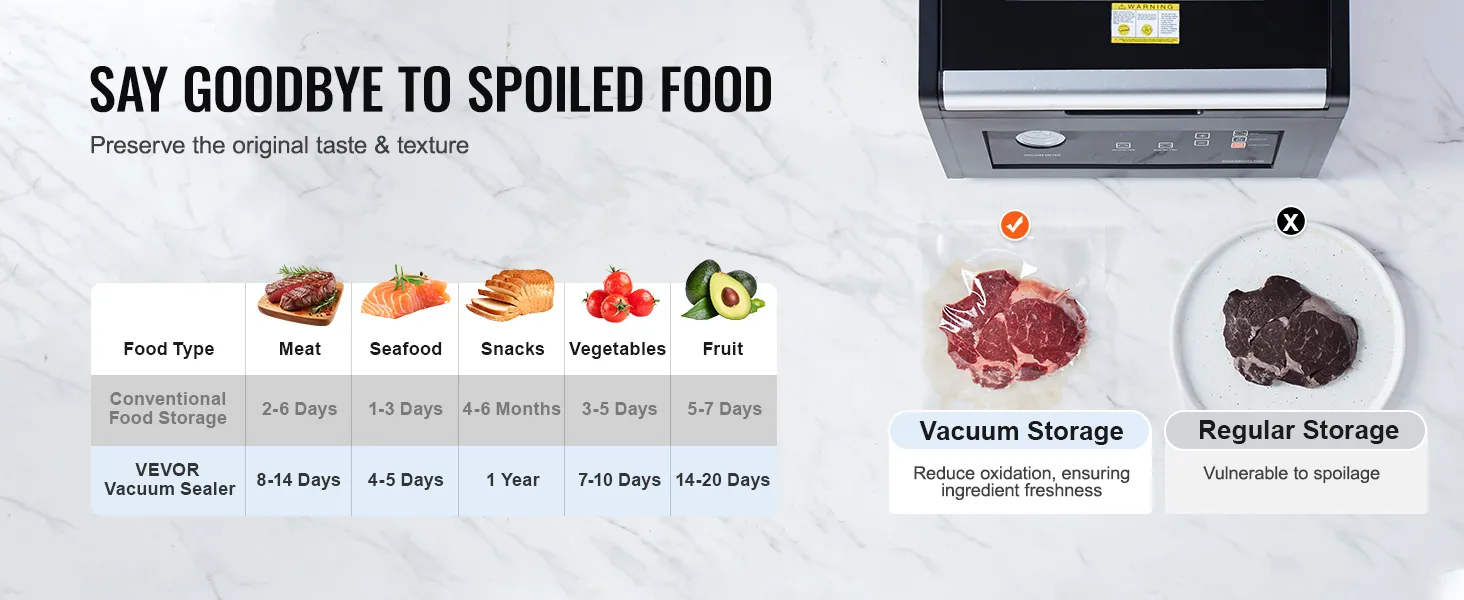 Dankzij de supervacuümprestaties (-95 Kpa+) van onze kamersealer blijft voedsel 3-5 keer langer vers. Sluit af en zet in de koelkast om koelkastgeuren te voorkomen en ervoor te zorgen dat elke hap net zo smaakt als de eerste.