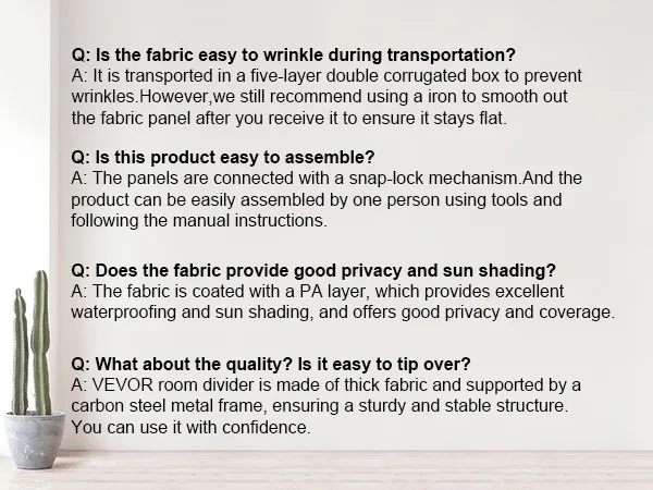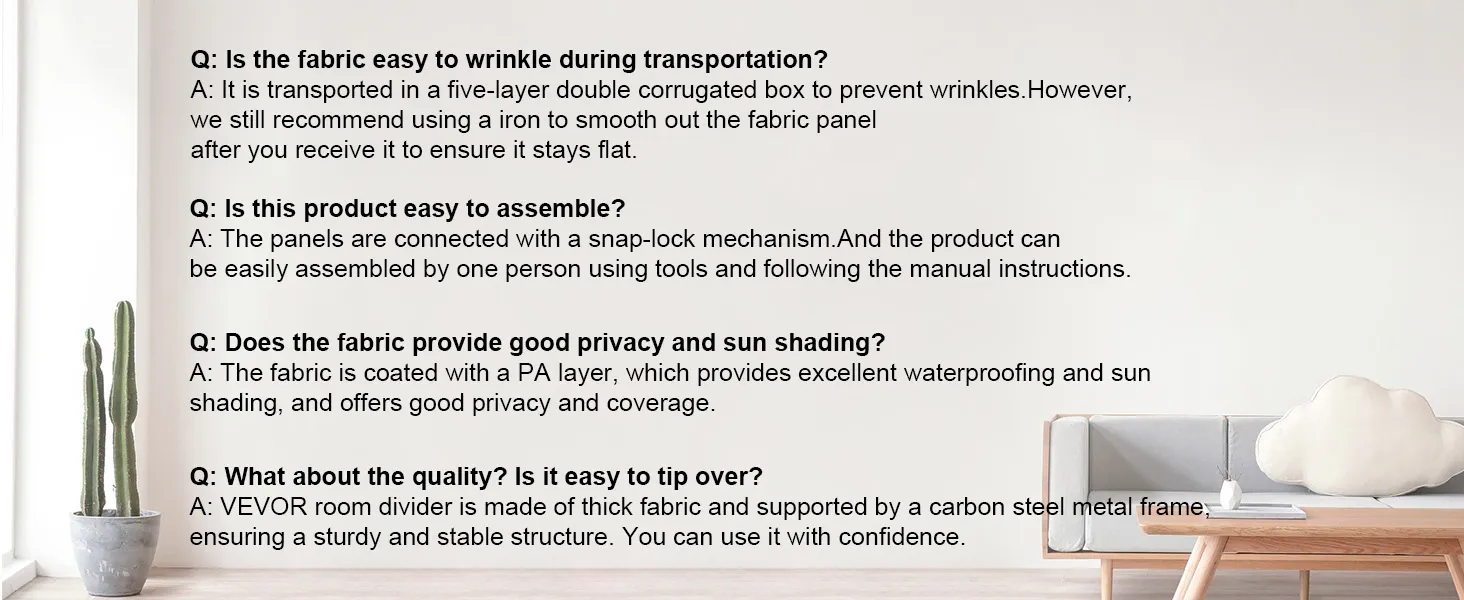 • Hassle-free Assembly: Our portable room divider panel wall can be assembled with screws, making it easy for one person to assemble by following the instructions in the manual. If you want a more efficient installation, it is recommended to use electric tools for installation. Please note that due to the fabric material, we suggest ironing the fabric before assembly. If you have any questions, don't hesitate to contact us.