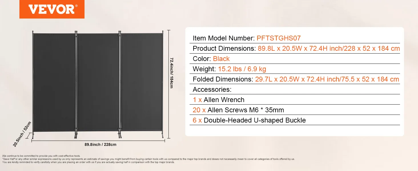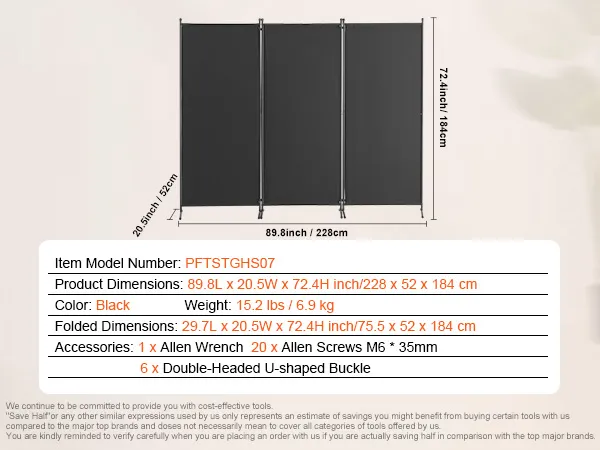 Stabiele en betrouwbare constructie: onze 3-delige kamerverdeler is eenvoudig te monteren met 6 verbindingsclips en een metalen frame van koolstofstaal. Voor extra stabiliteit hebben we twee metalen voetstukken toegevoegd. Hierdoor is onze scheidingswand stabiel en kan deze niet zomaar omvallen door huisdieren of kinderen.