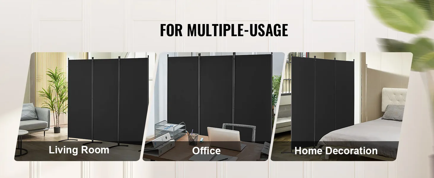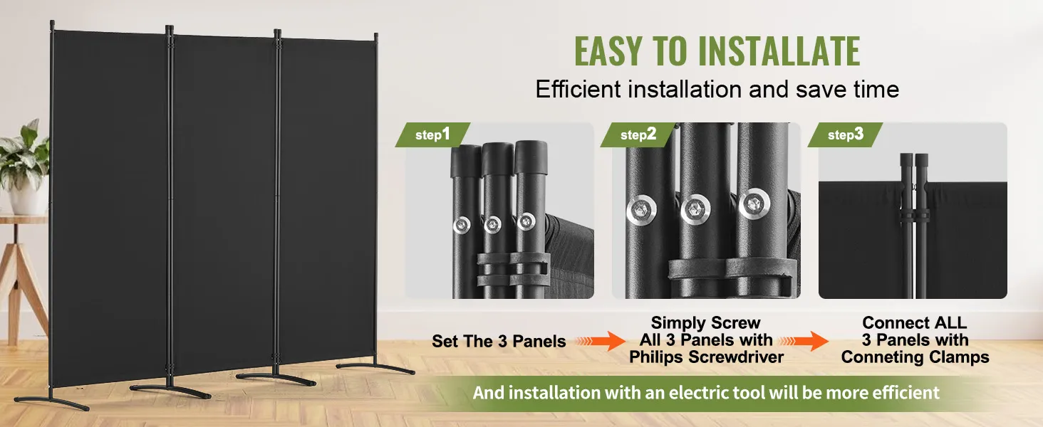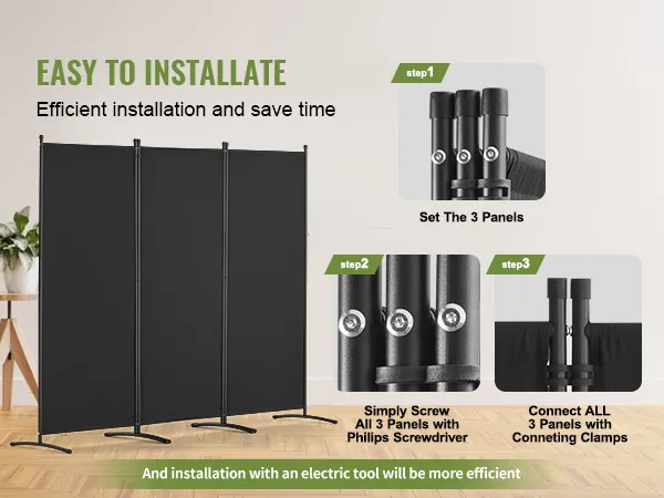 Perfect voor elke kamer: het roomdividerpaneel kan in verschillende omgevingen worden gebruikt, zoals slaapkamers, woonkamers, kantoren en ziekenhuizen, om privéruimtes te creëren. OPMERKING: Als u wilt dat de kamerverdelers stabieler zijn, kunt u de poten van de kamerverdelers vastzetten met schroeven J. Het installeren met elektrisch gereedschap is efficiënter.