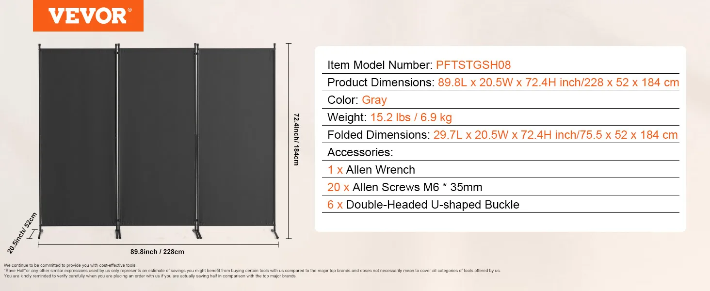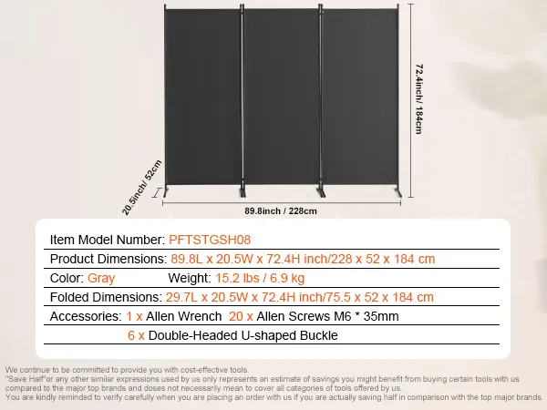 Flexible & Folding Design: It features an open size of 89.8x72.4x20.5 in/228x184x52 cm (LxWxH). You can adjust the height of each panel connecting clip, and there are flexible panel combination options to customize the wall size. When folded, it measures 29.7x72.4x20.5 in/75.5x184x52 cm(LxWxH), taking up less than 1 square meter for space-saving storage.