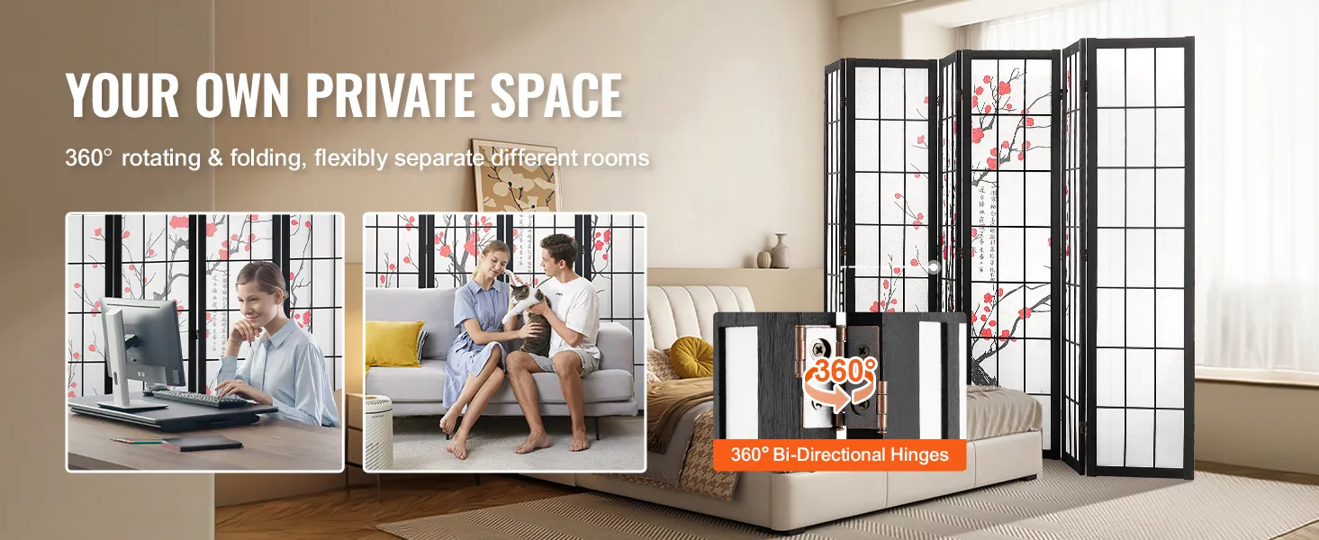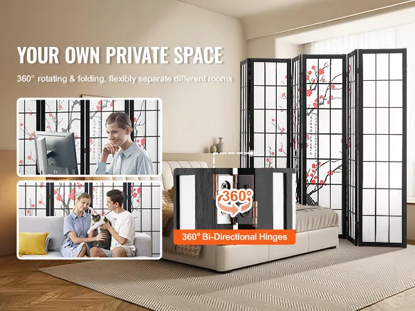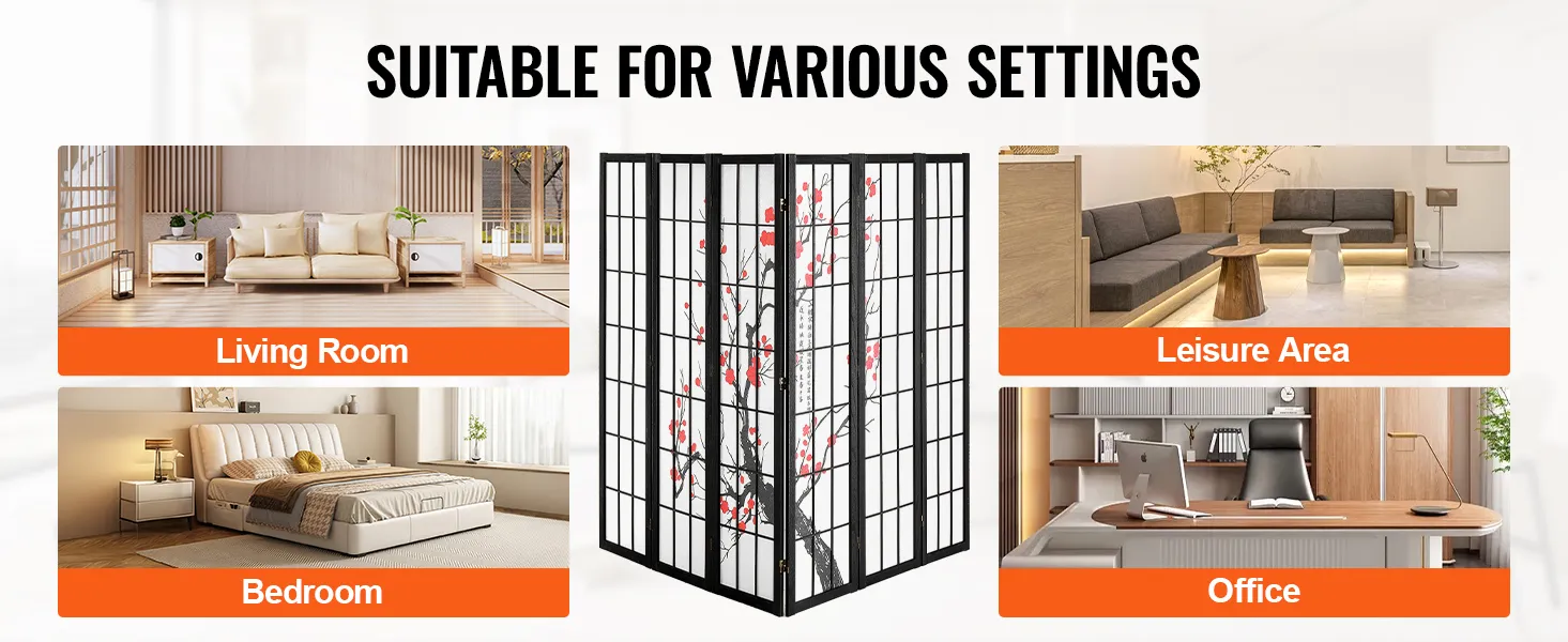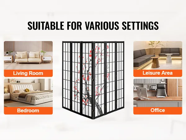 Japans minimalisme: de VEVOR-ruimteverdeler vergroot uw ruimte, en deze 242 cm grote kamerverdeler in Japanse stijl is ontworpen met drie elegante panelen die veel privacy bieden. Het biedt royale privacy, zodat u vrijer van het leven kunt genieten. Het symmetrische rasterontwerp, gecombineerd met een kamerverdeler in inktschilderijstijl, creëert een verbluffende balans tussen functie en decor, waardoor een vleugje traditionele Aziatische kunst aan uw huis wordt toegevoegd.