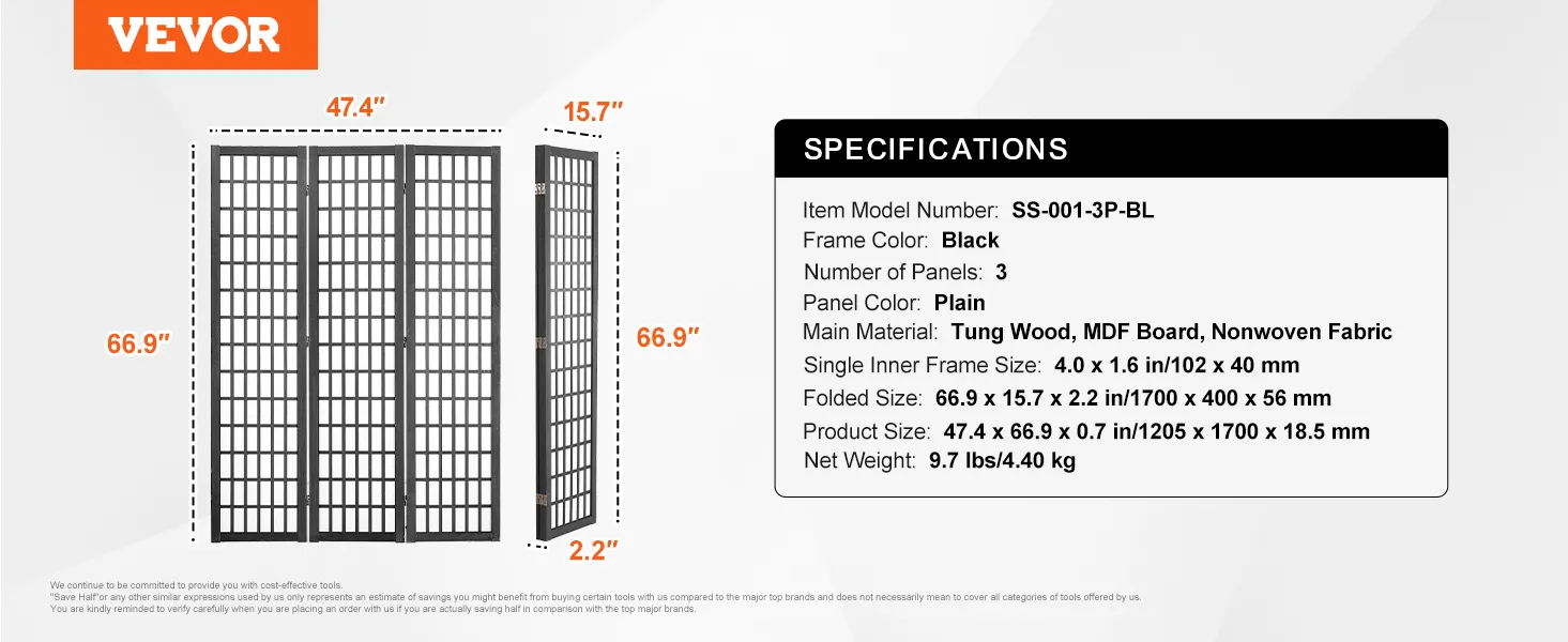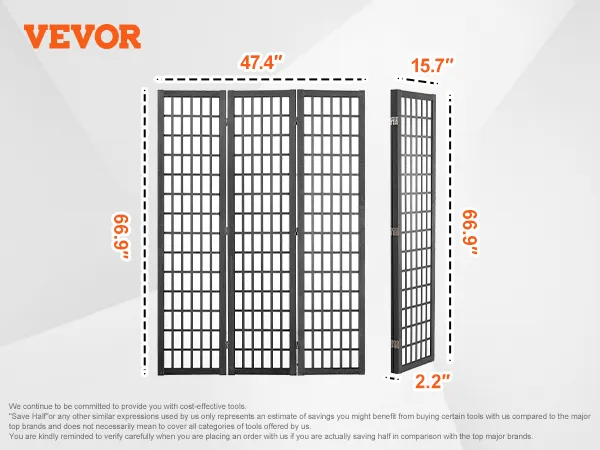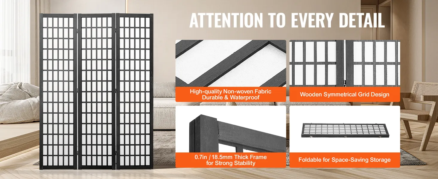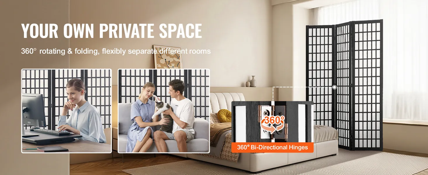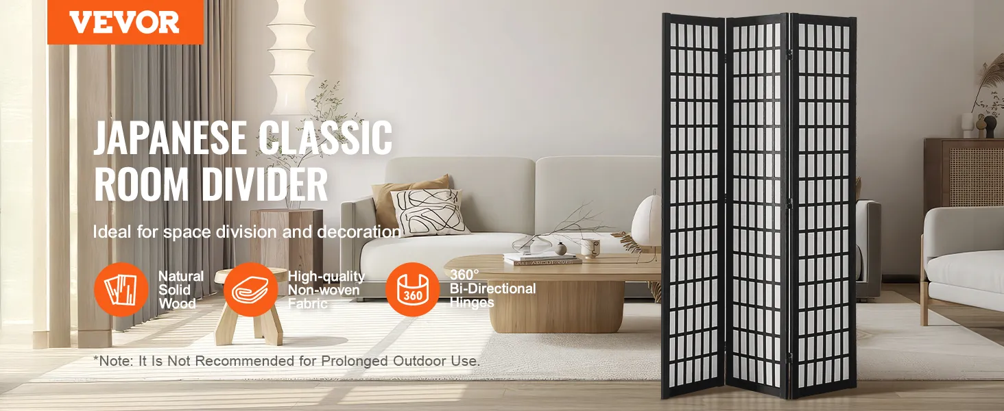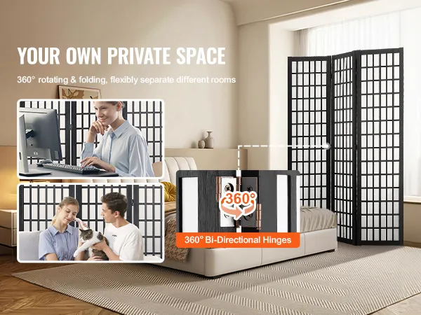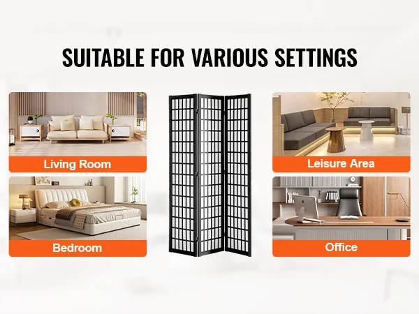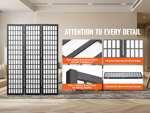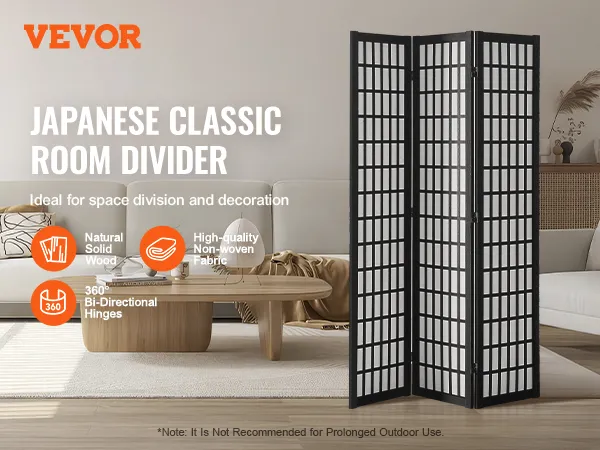 Japans minimalisme: de VEVOR-ruimteverdeler vergroot uw ruimte, en deze 47,4-inch (1205 mm) kamerverdeler in Japanse stijl is ontworpen met drie elegante panelen die veel privacy bieden. Het slanke, symmetrische houten rooster is de ideale mix van functionaliteit en stijl en voegt een vleugje klassieke Japanse charme toe aan uw huis terwijl u zich comfortabel voelt.
