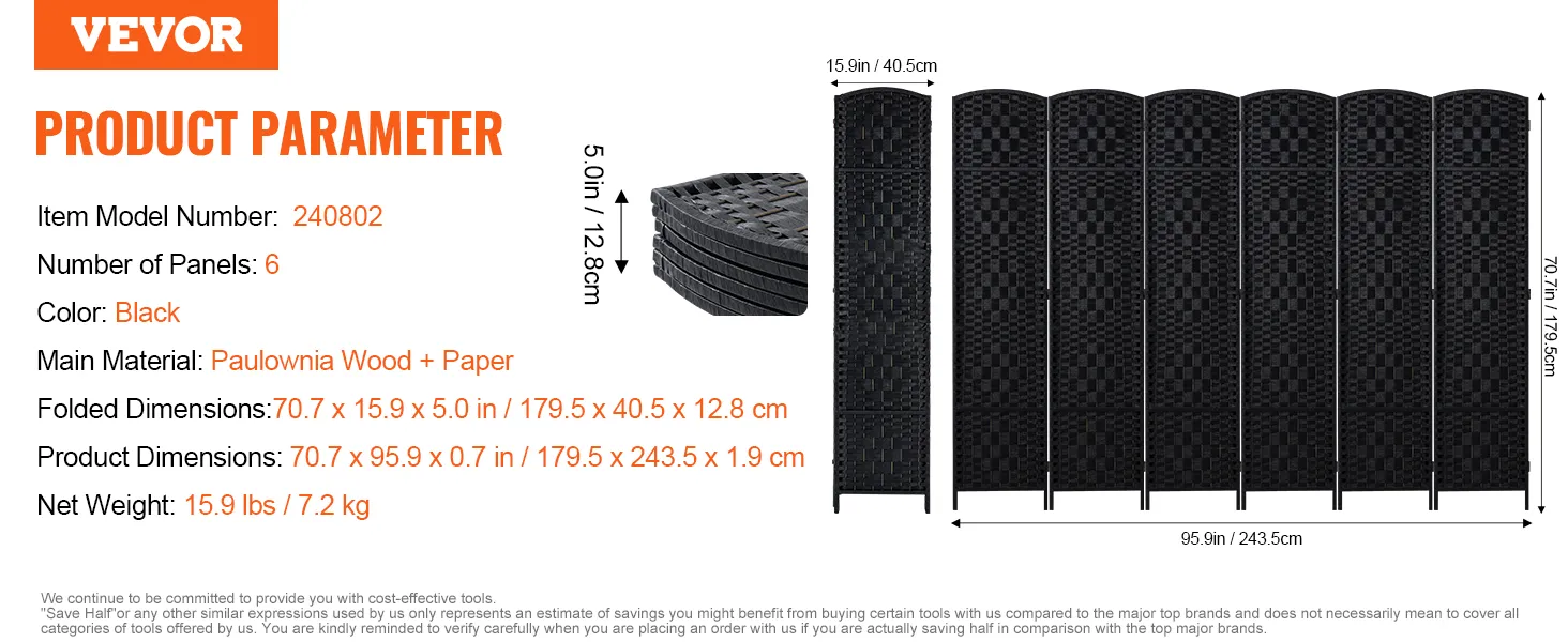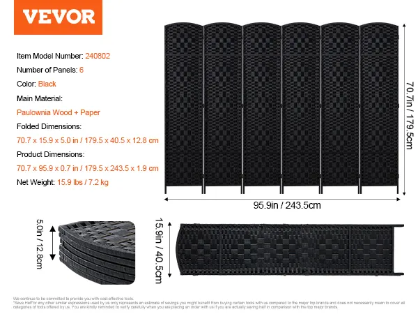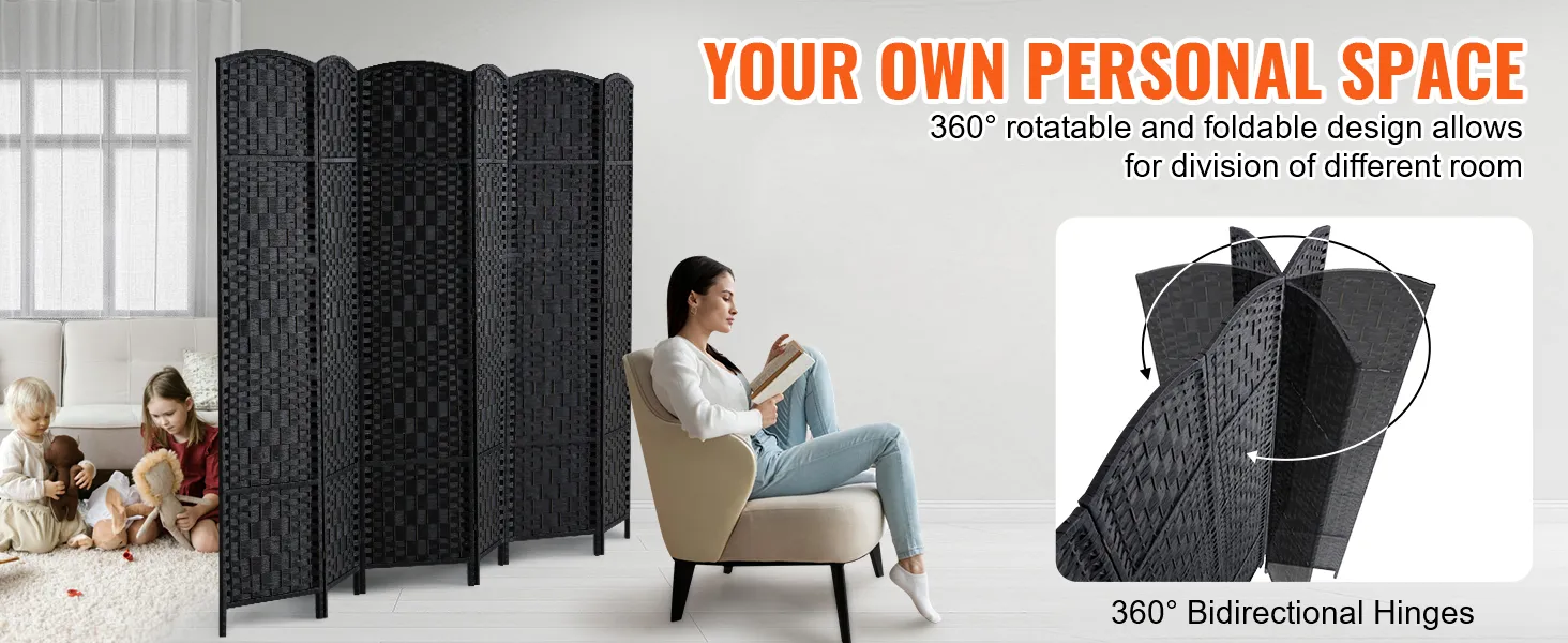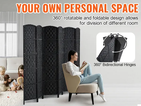 VEVOR 6 Panel Room Divider, Hand-Woven Folding Privacy Screens with Hinges, Portable and Freestanding Partition Room Dividers and Wall Divider for Room Separation, Black