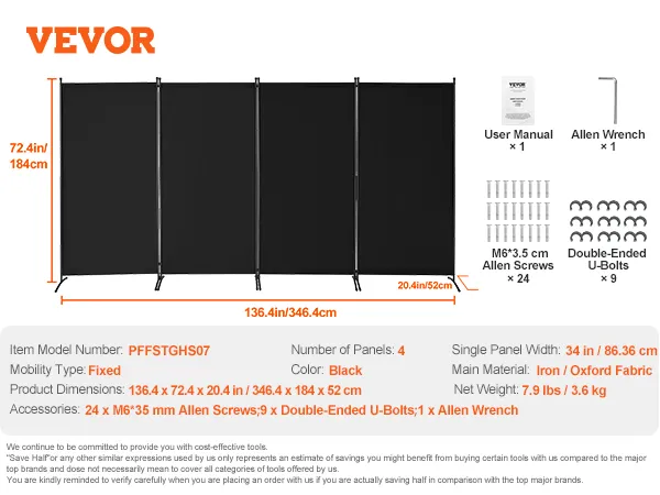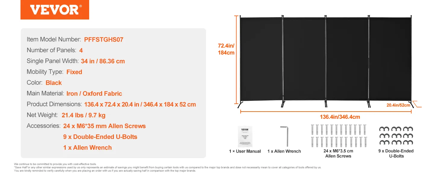 • Easy to Store: The privacy screen measures (136.4 x 72.4 x 20.4 in / 3464 x 1840 x 520 mm), each panel measures 34 W x 72.4 H inch. It's foldable, you can easily move to anywhere you want.