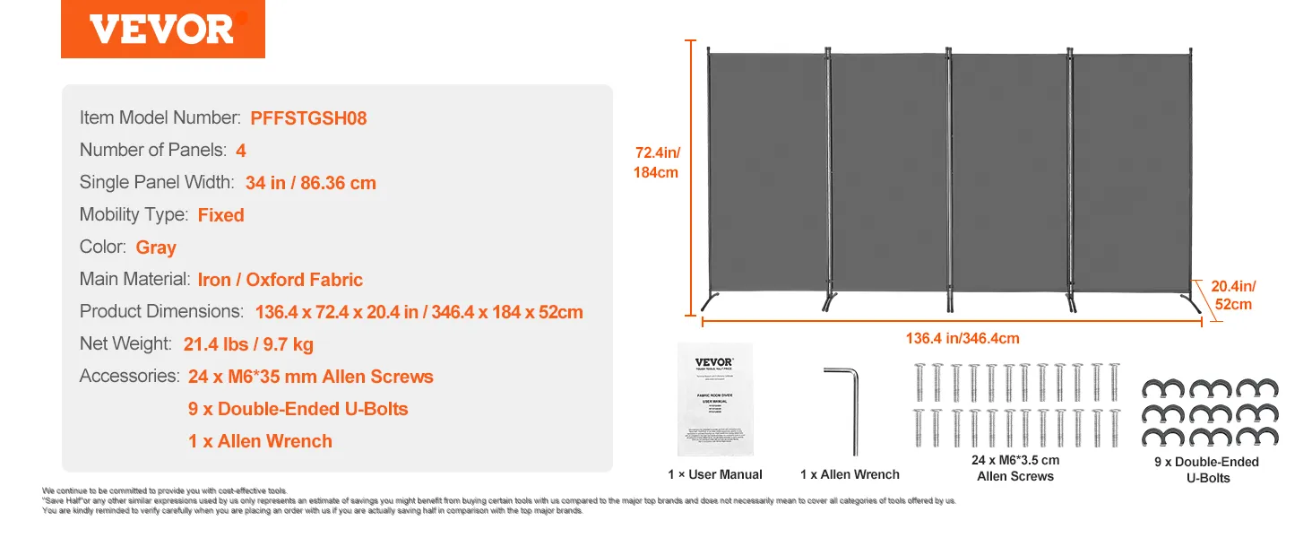 • Easy to Store: The privacy screen measures (136.4 x 72.4 x 20.4 in / 3464 x 1840 x 520 mm), each panel measures 34 W x 72.4 H inch. It's foldable, you can easily move to anywhere you want.