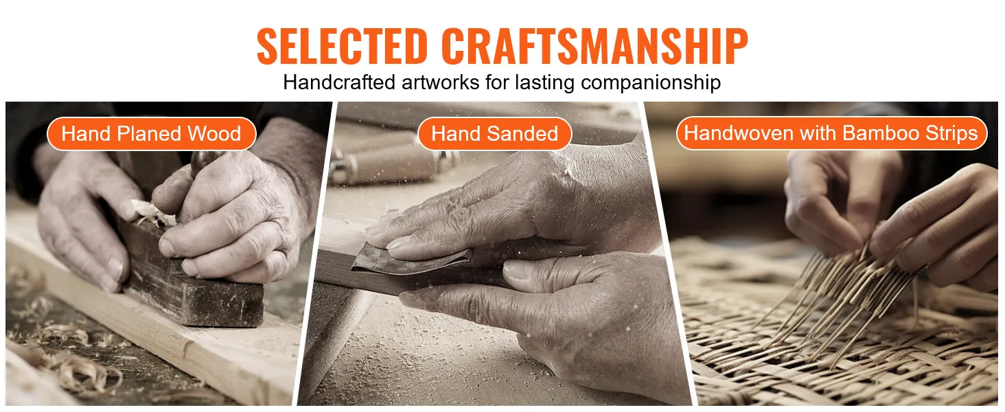 Premium Durable Materials: We use high-quality Paulownia wood with fine texture and distinctive wood grain for the frame, which resists deformation and cracking over long-term use. Handwoven with bamboo strips for a stunning, non-rigid shape that remains sturdy and smooth, with no sharp edges or splinters, ensuring your hands stay safe.