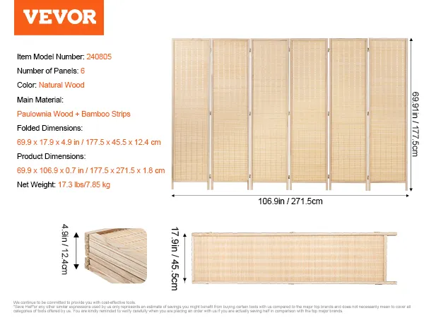Classic Woven Room Divider: This room divider consists of 6 panels with a modern style, providing a large area of privacy for your space. Handwoven with bamboo strips, it features clean, crisp lines, making it a perfect blend of privacy screen and decorative element, adding a hint of natural, laid-back comfort to your home.