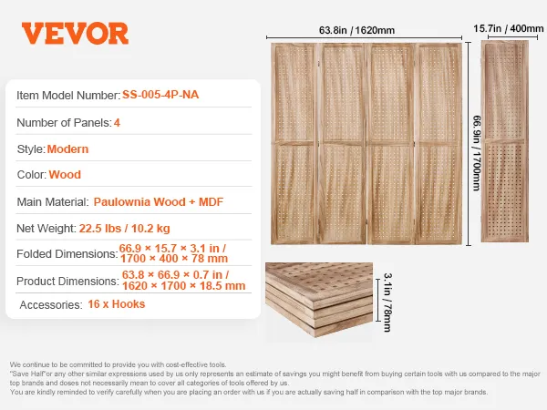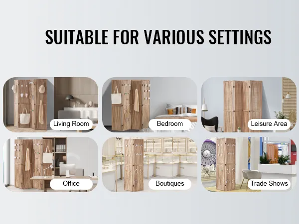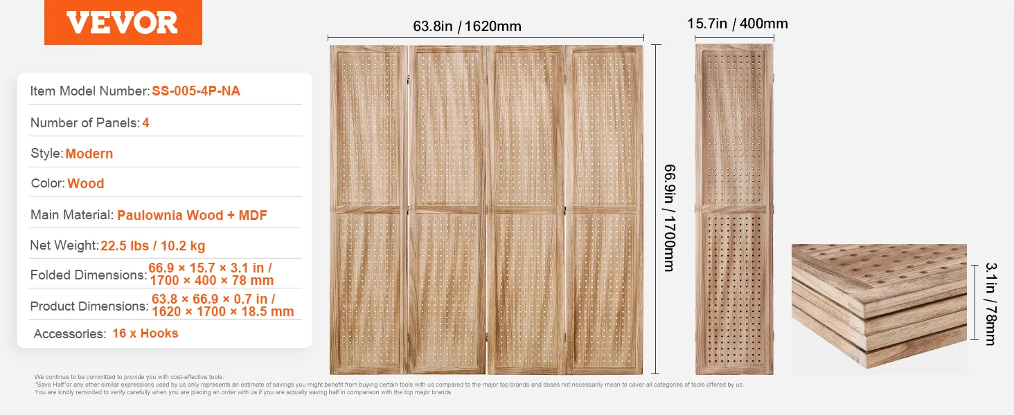 Hanging Display Design: This room divider panel’s each panel has 432 pegboard holes, each 0.3 inches compatible with pegboard hooks. You can easily rotate and fold this carved wood divider in shops, boutiques, trade shows, and flea markets or as a stylish home partition and decor.