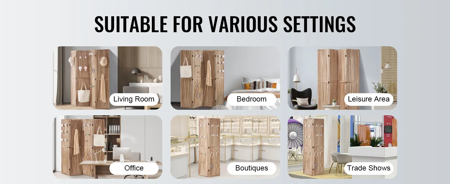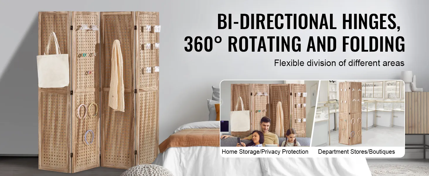This room divider, made from Paulownia wood, features a pegboard design for hanging hats and scarves. It has 360° rotating panels and flexible folding, making it ideal for separating spaces in homes and shops.