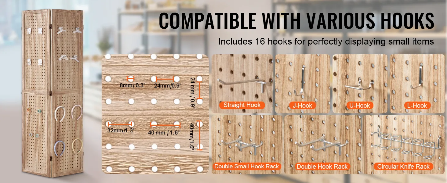 This screen room divider’s each panel has 432 pegboard holes, which are compatible with pegboard hooks, making it easy to display various small items.