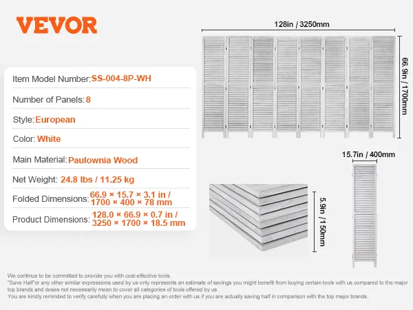 VEVOR stijlvolle houten roomdivider met 8 panelen