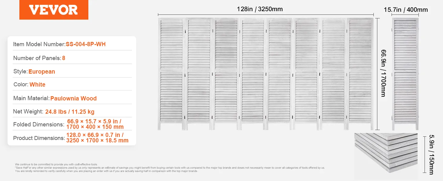 VEVOR kamerscherm, 8 panelen houten opvouwbaar privacyscherm, 325 cm lange kamerscherm, draagbaar decoratief scherm voor kamerafscheiding in Europese stijl voor thuis, restaurant, slaapkamer