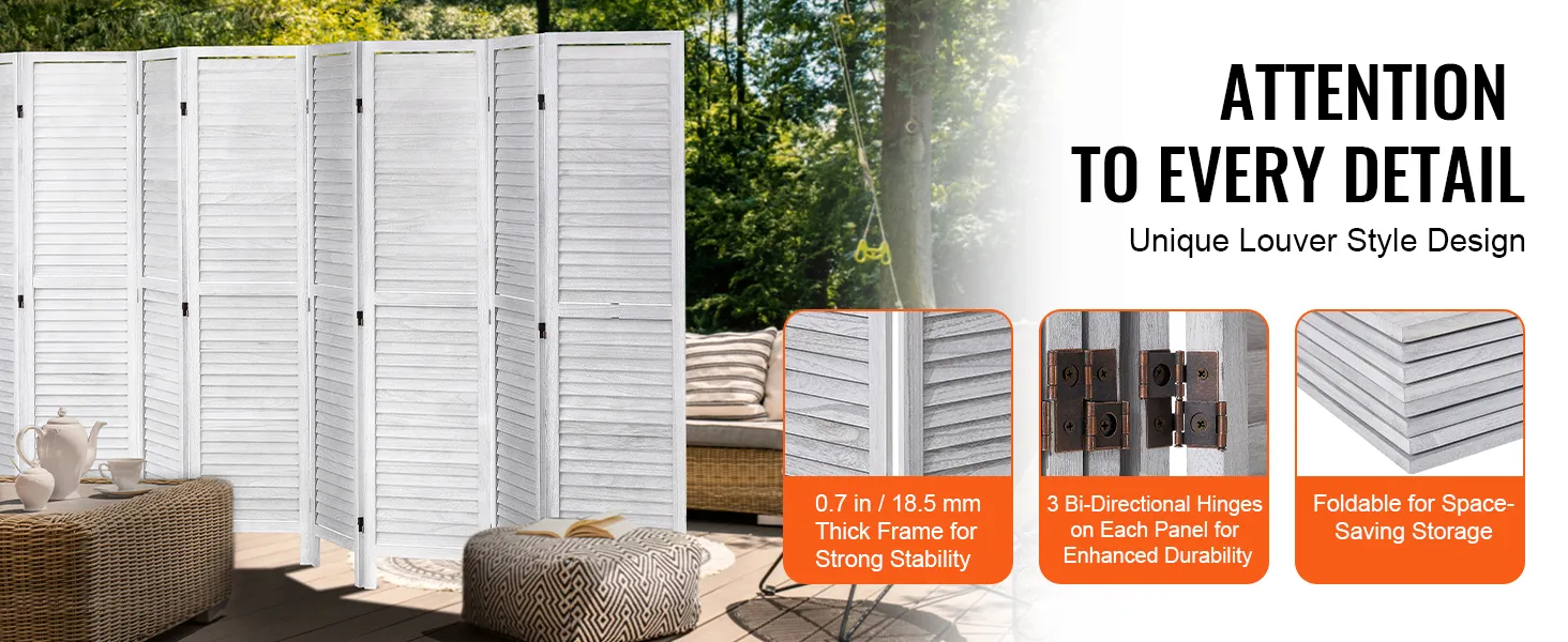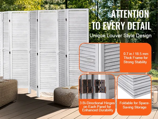 De versterkte steunpoten en het dikke houten frame van de houten scheidingswand verbinden de panelen met drie scharnieren die aan beide zijden bewegen, wat zorgt voor meer stabiliteit en veiligheid.