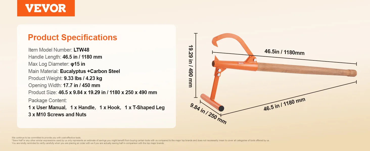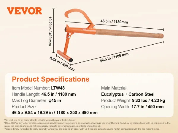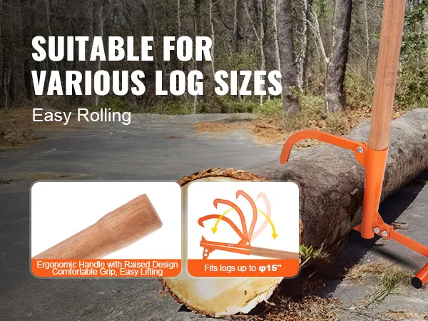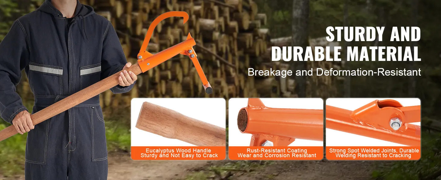 Ergonomisch handvat: Met een 46,5 inch / 1180 mm lang houten handvat met een verhoogd ontwerp biedt deze houthakker een comfortabele, veilige grip bij het optillen en trekken van boomstammen, waardoor spanning en vermoeidheid worden verminderd.