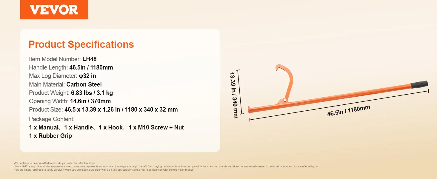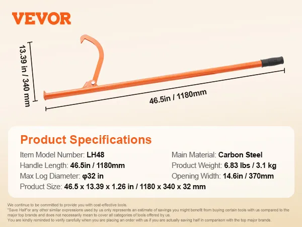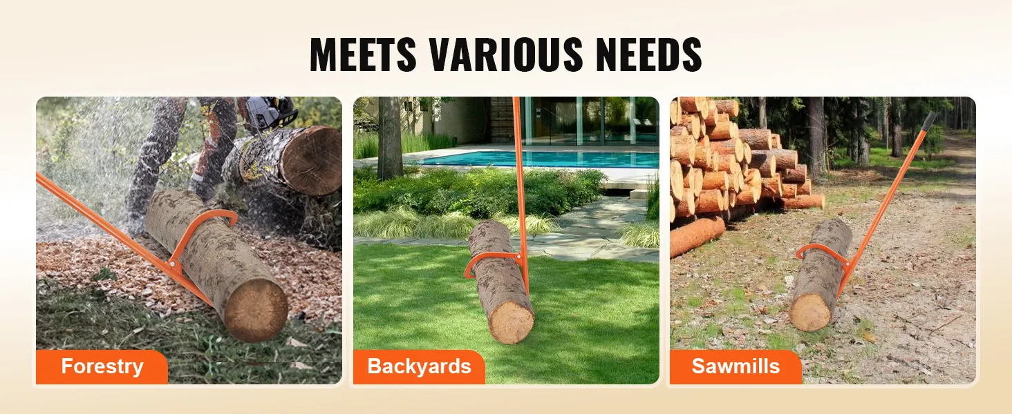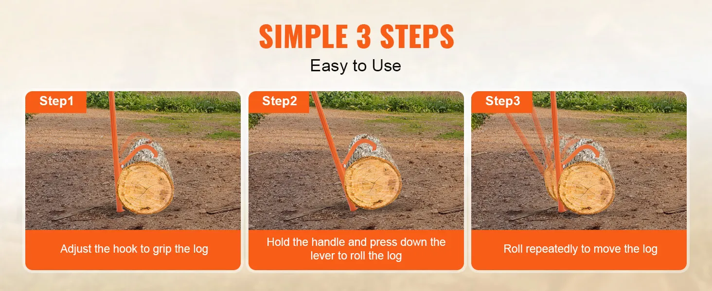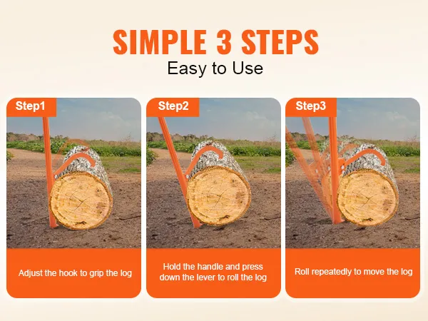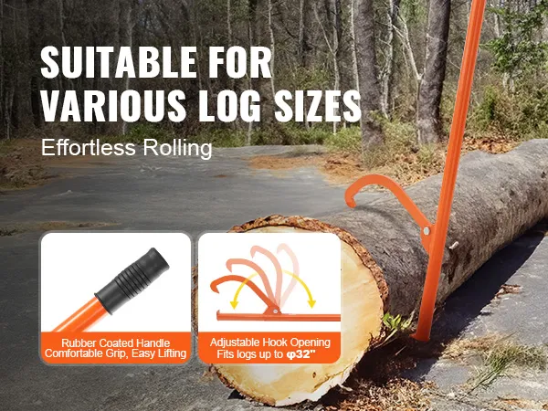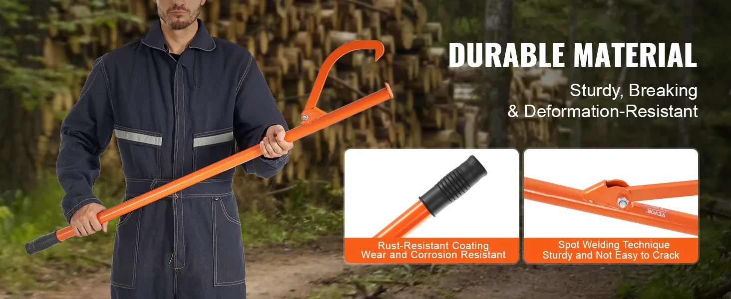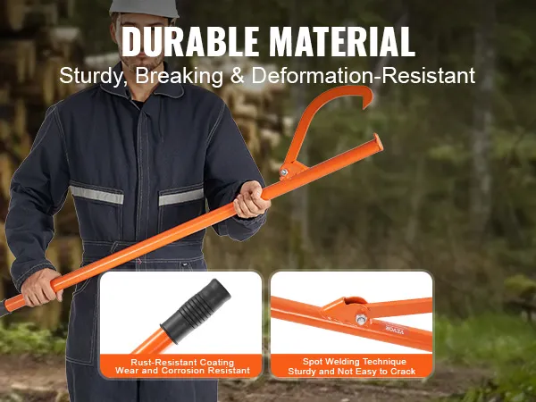 Ergonomische handgreep: met 46,5 inch / 1180 mm lange, met rubber beklede handgrepen biedt deze houtroller een comfortabele en veilige grip bij het optillen en trekken van boomstammen, waardoor de belasting wordt verminderd en vermoeidheid wordt voorkomen.