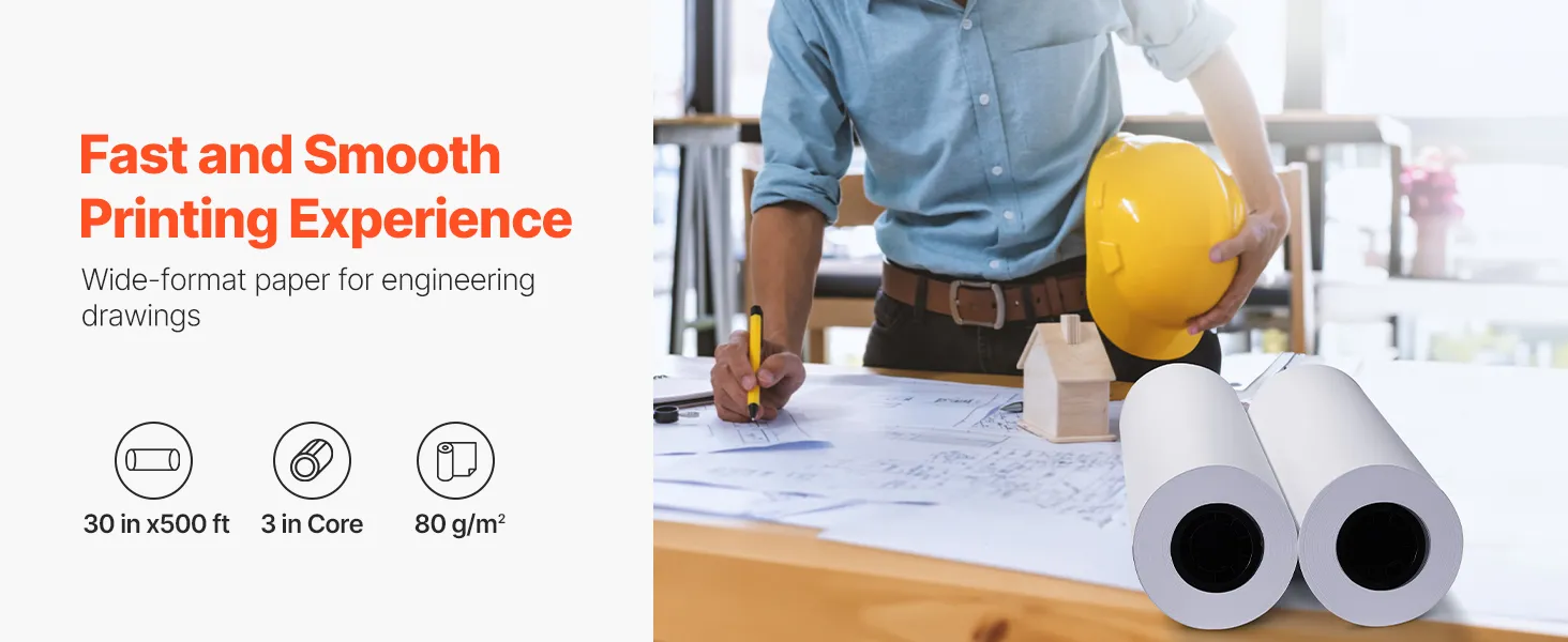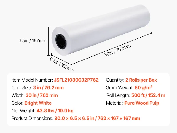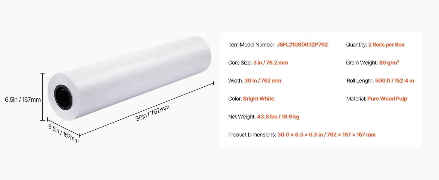 Rollen van standaardformaat: Dit breedformaat papier wordt geleverd in een doos met twee rollen, elk 762 mm breed en met een totale lengte van 152,4 m (500 lbs). Het levert nauwkeurige, continue printresultaten, ideaal voor grootformaat technische tekeningen en architectuurplannen. De kern van 3 inch past op de meeste standaard plotterprinters.
