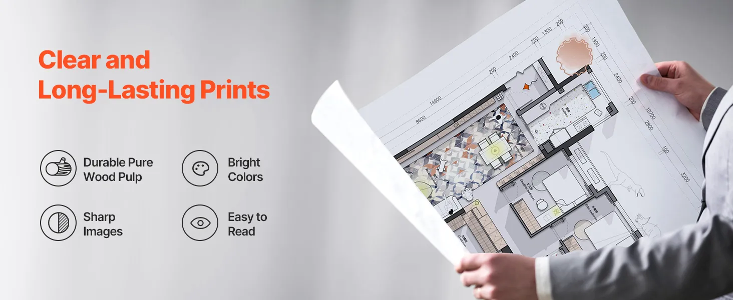Heldere en levendige weergave: Deze CAD-papierrol, gemaakt van pure pulp, zorgt voor een gelijkmatige verdeling van inkt, pigmenten en lijnen tijdens het printen en tekenen. Het levert scherpe, levendige en gemakkelijk leesbare resultaten met superieure kleurdiepte en blijvende helderheid.