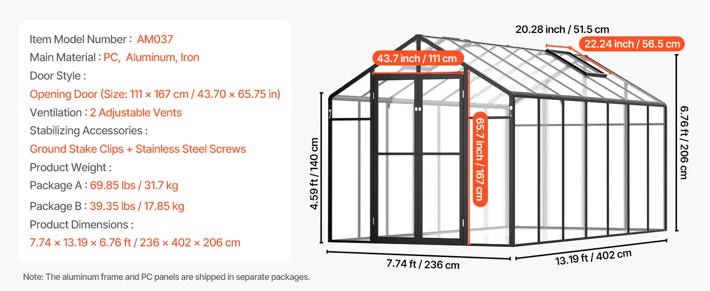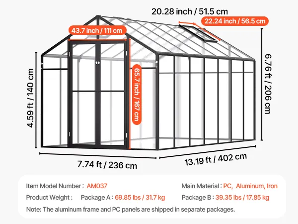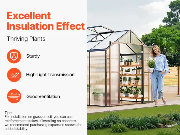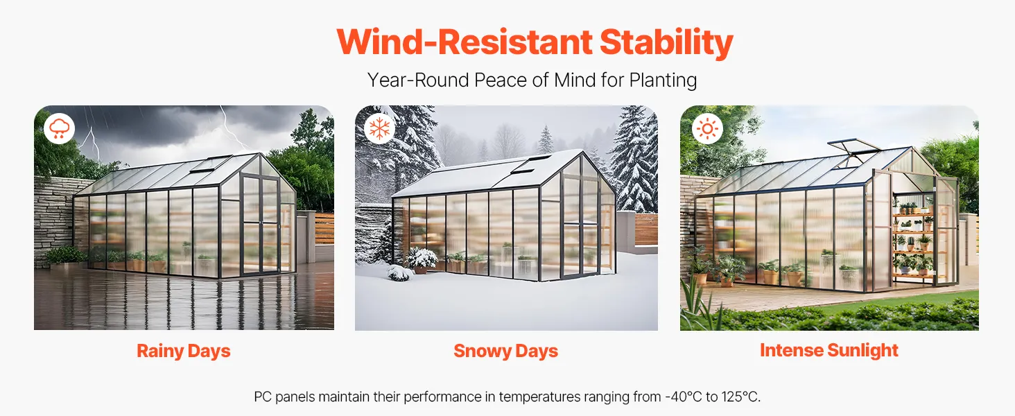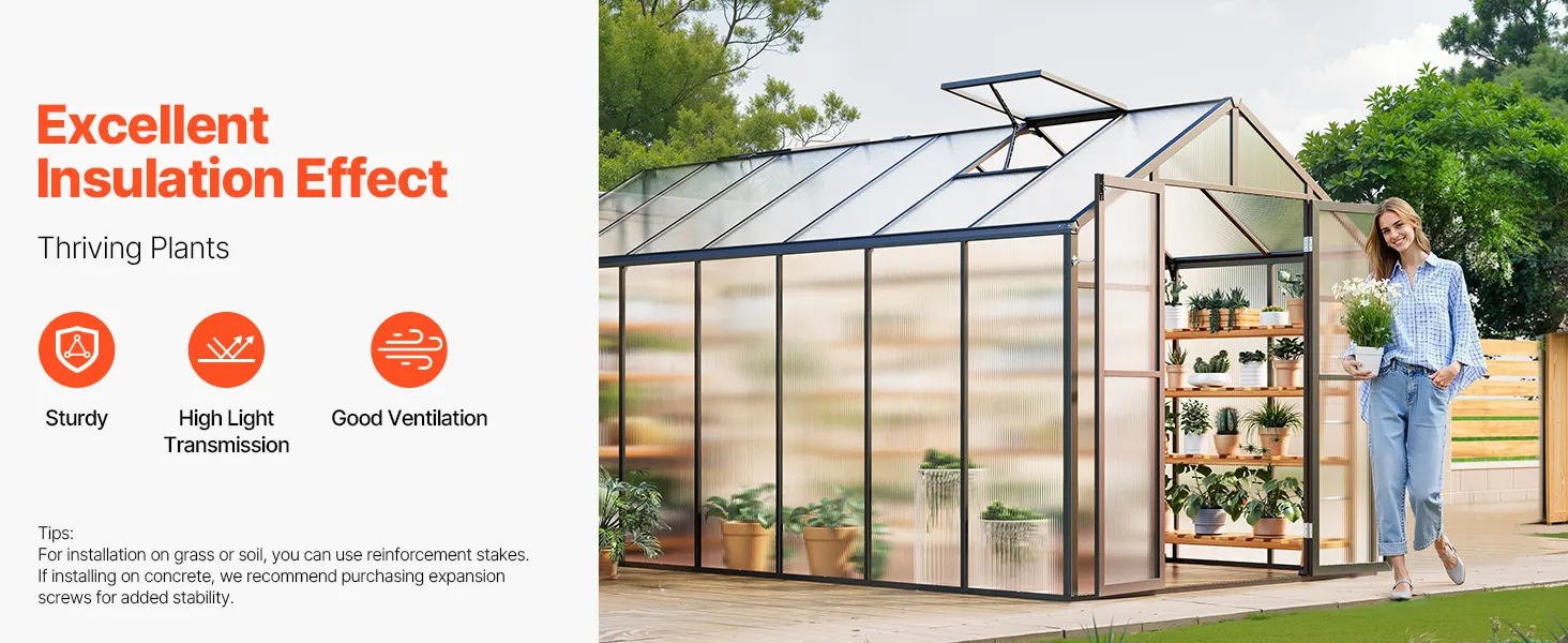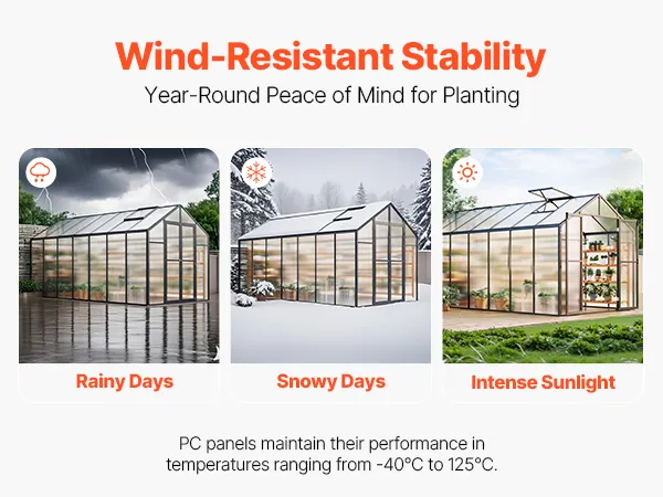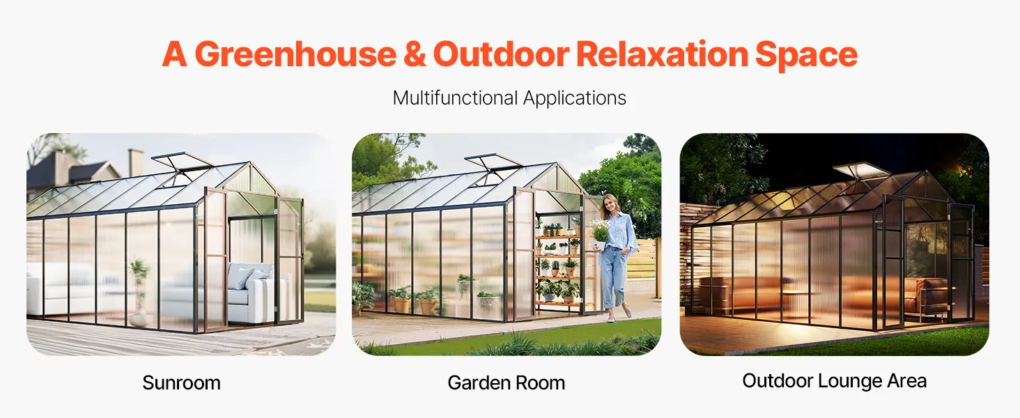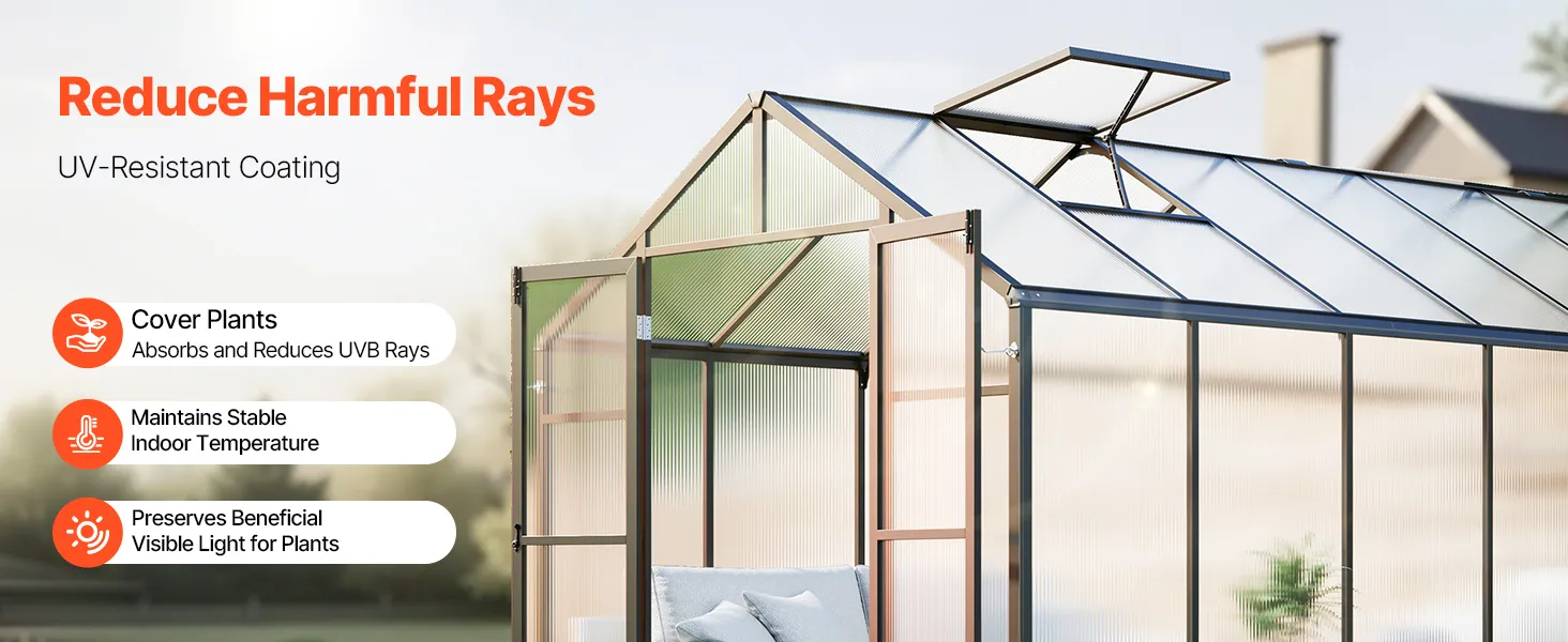 Deze kas van polycarbonaat heeft een stevig frame van aluminiumlegering en slagvaste PC-panelen met 89% lichttransmissie voor UV-bestendigheid.