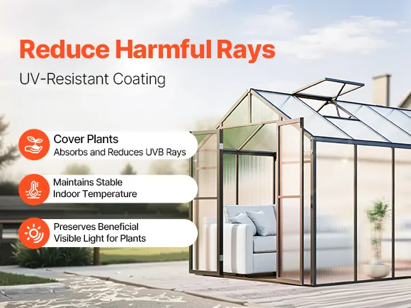 De PC-panelen zijn bedekt met een effectieve UV-bestendige laag die uw planten beschermt tegen schadelijke UV-stralen. Deze coating laat nuttig zichtbaar licht door en blokkeert overmatige UV-straling.