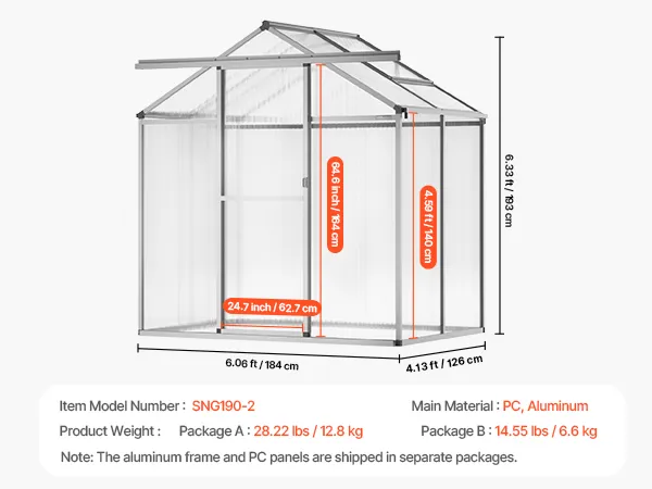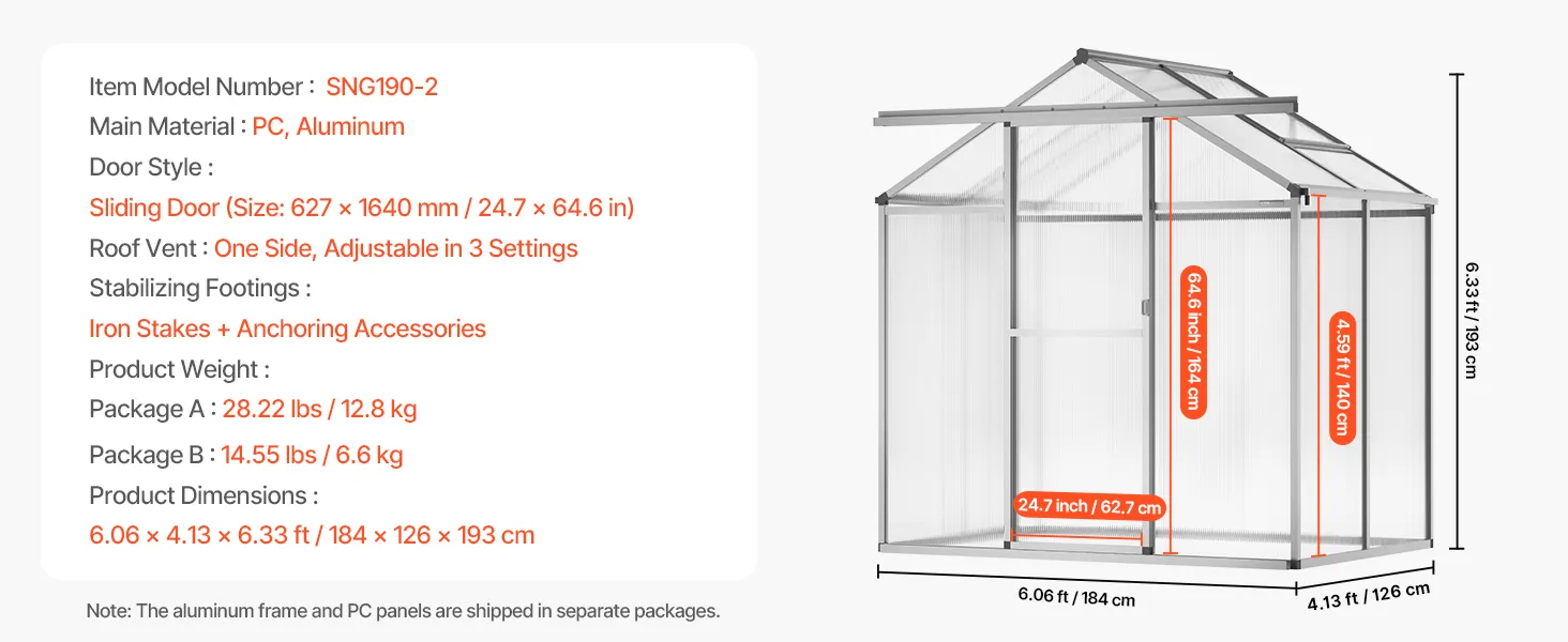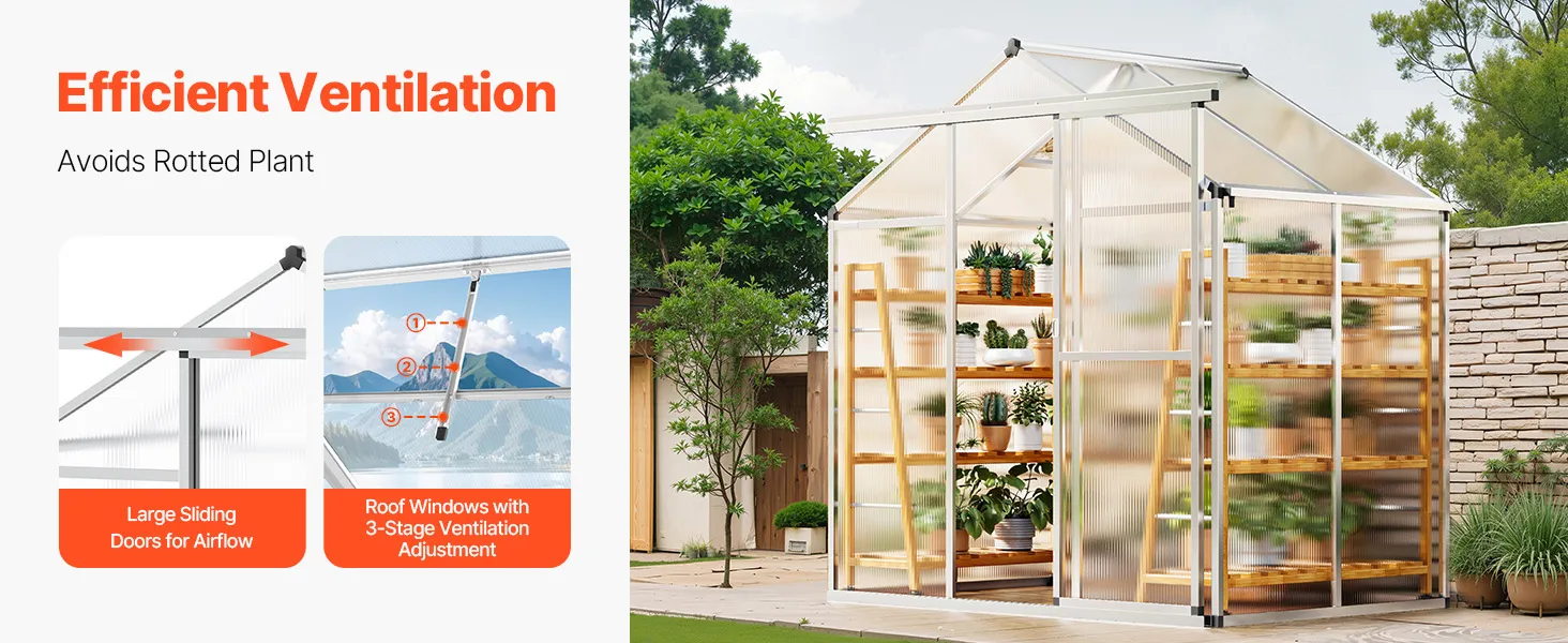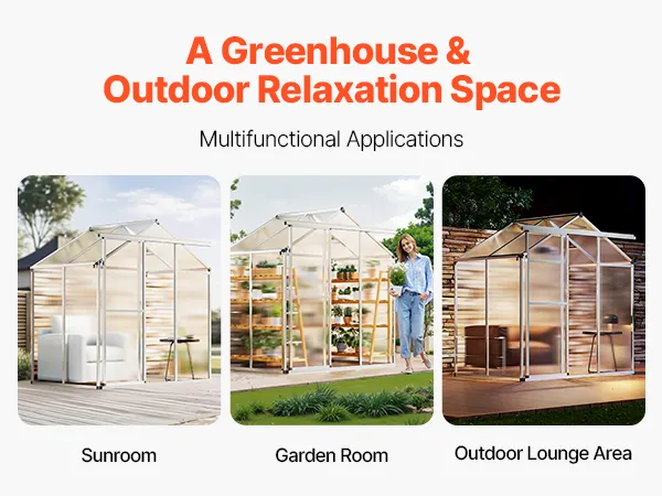 This polycarbonate greenhouse features a durable aluminum alloy frame and impact-resistant PC panels, with 89% light transmittance for UV resistance. The large opening doors and three-stage adjustable roof windows ensure effective ventilation. It can function as a sunroom and garden room.