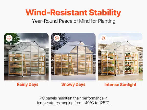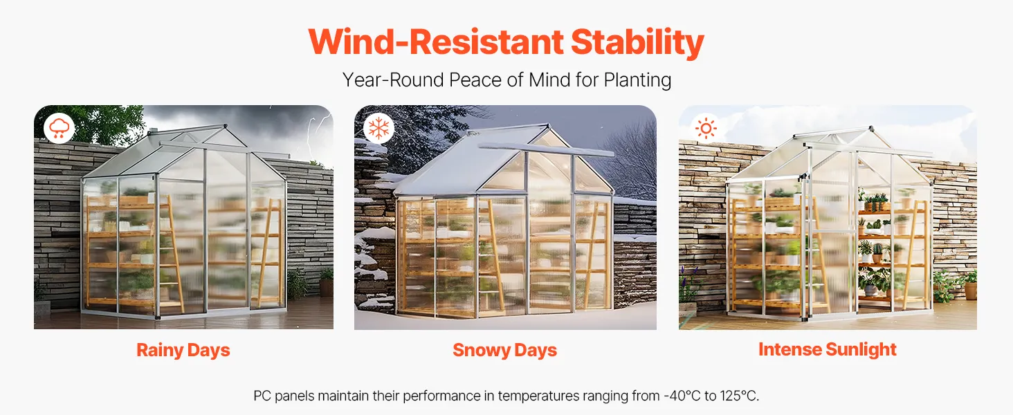Durable and Sturdy: The aluminum frame of the polycarbonate greenhouse is corrosion-resistant, and the polycarbonate panels are impact-resistant, UV-resistant, and maintain their performance within the temperature range of -40°C to 125°C, adapting to various weather conditions. Stakes can be used to further enhance the wind resistance.
